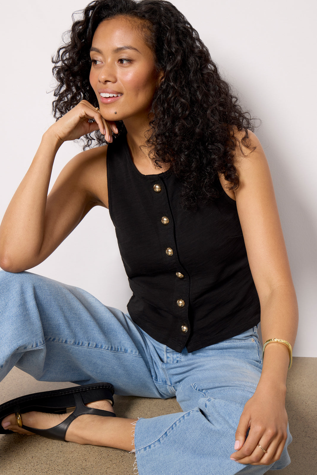 Gold buttons add an elegant touch to the Abbie Tank by Nation LTD. featuring a soft cotton fabric. crew neckline. and a cropped fit.