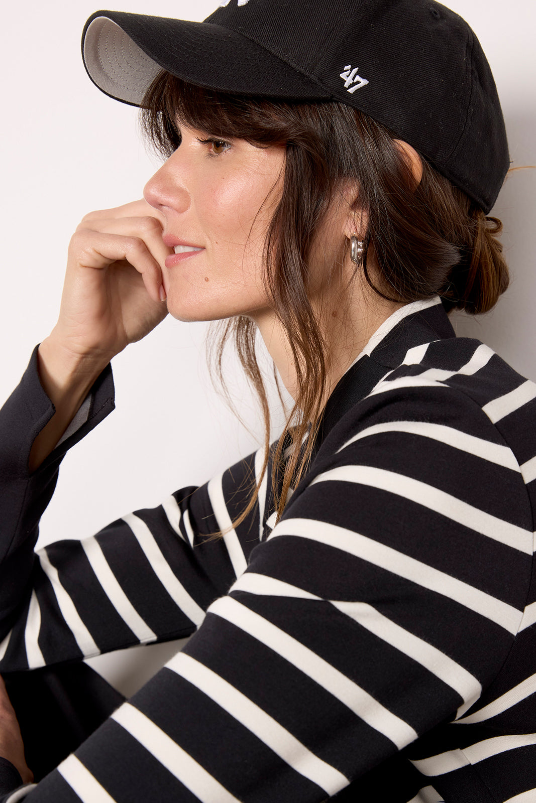 Laidback and luxe. this striped sweatshirt by Spanx will be your favorite everyday staple. Finished with a mock neckline and split cuffs. this relaxed pullover is crafted in airy. ultra-soft fabric for throw-on-and-go comfort.