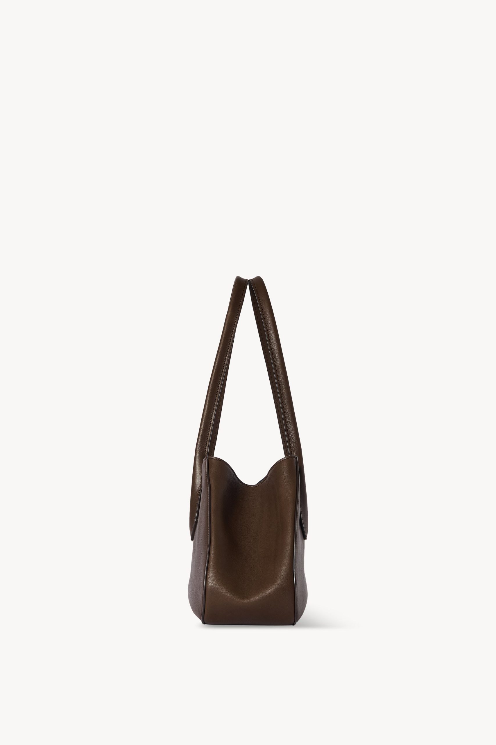 Geometric shoulder bag in polished saddle leather with tubular handles. flat base. and hand-stitched construction.