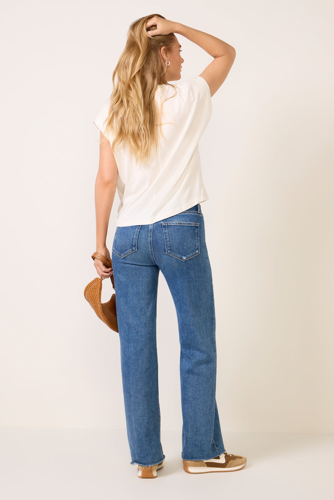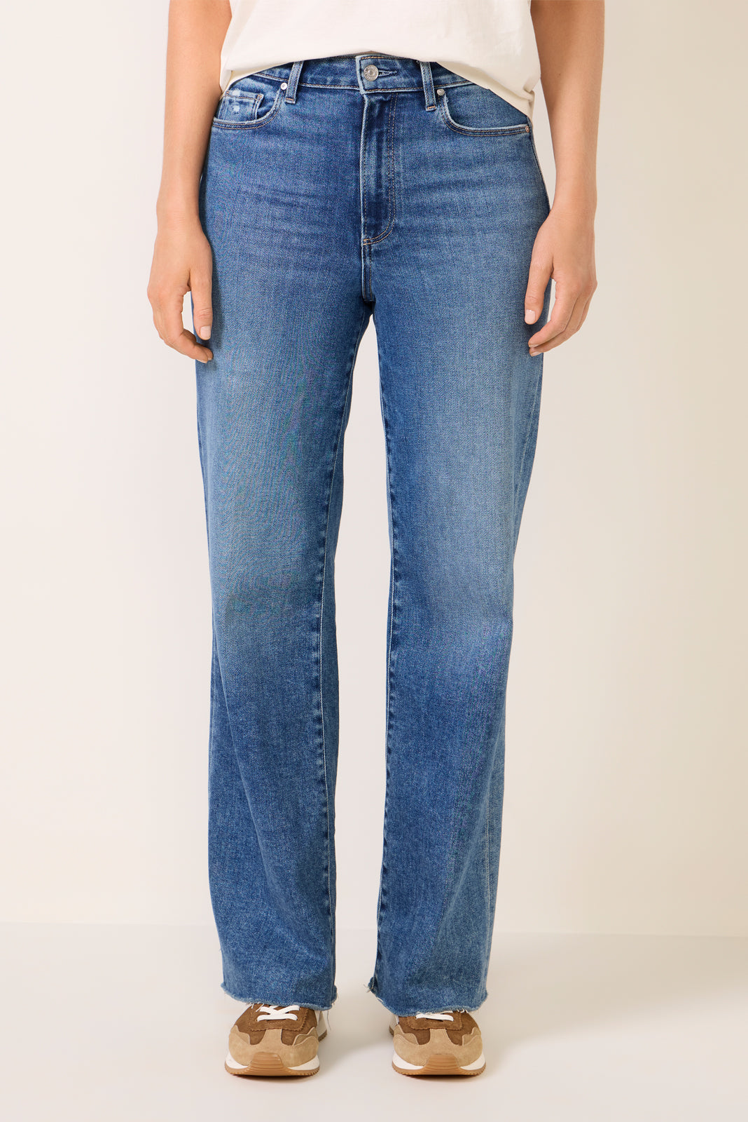 The wide leg jean you’ll be wearing on repeat. Finished with a full-length 31 inseam. these Paige jeans are crafted in soft stretch denim with a flattering high-rise fit.?medium?blue wash. and raw hems.
