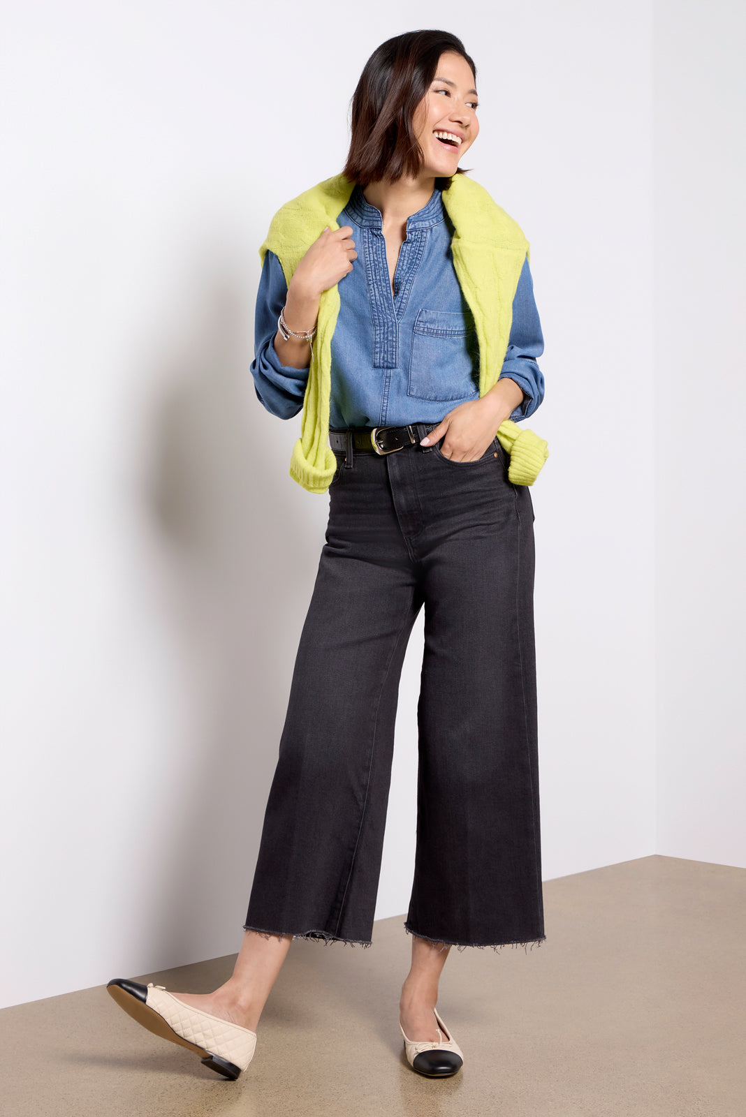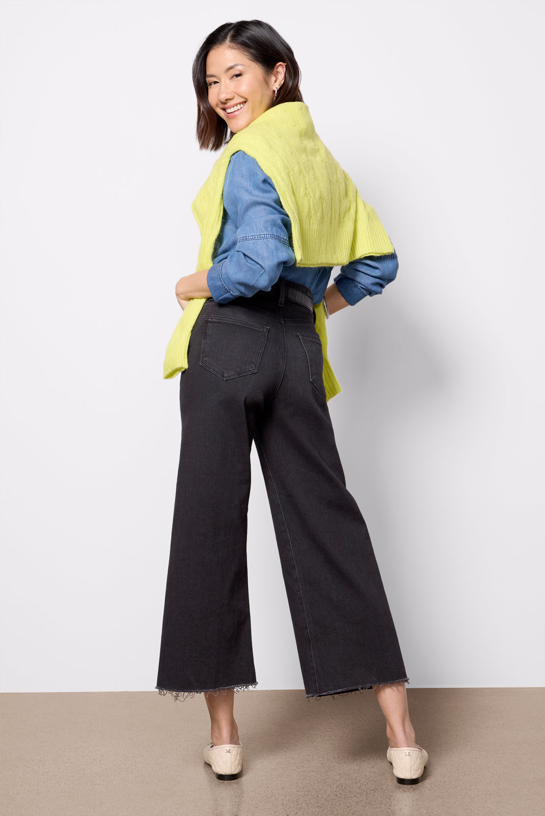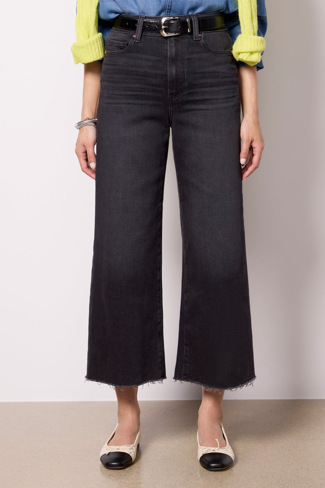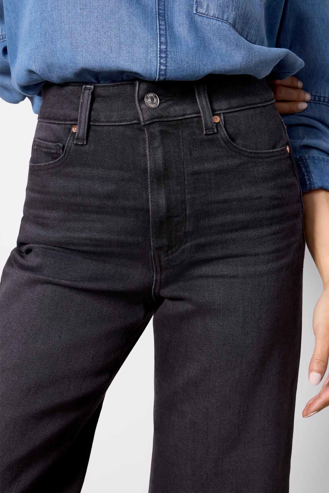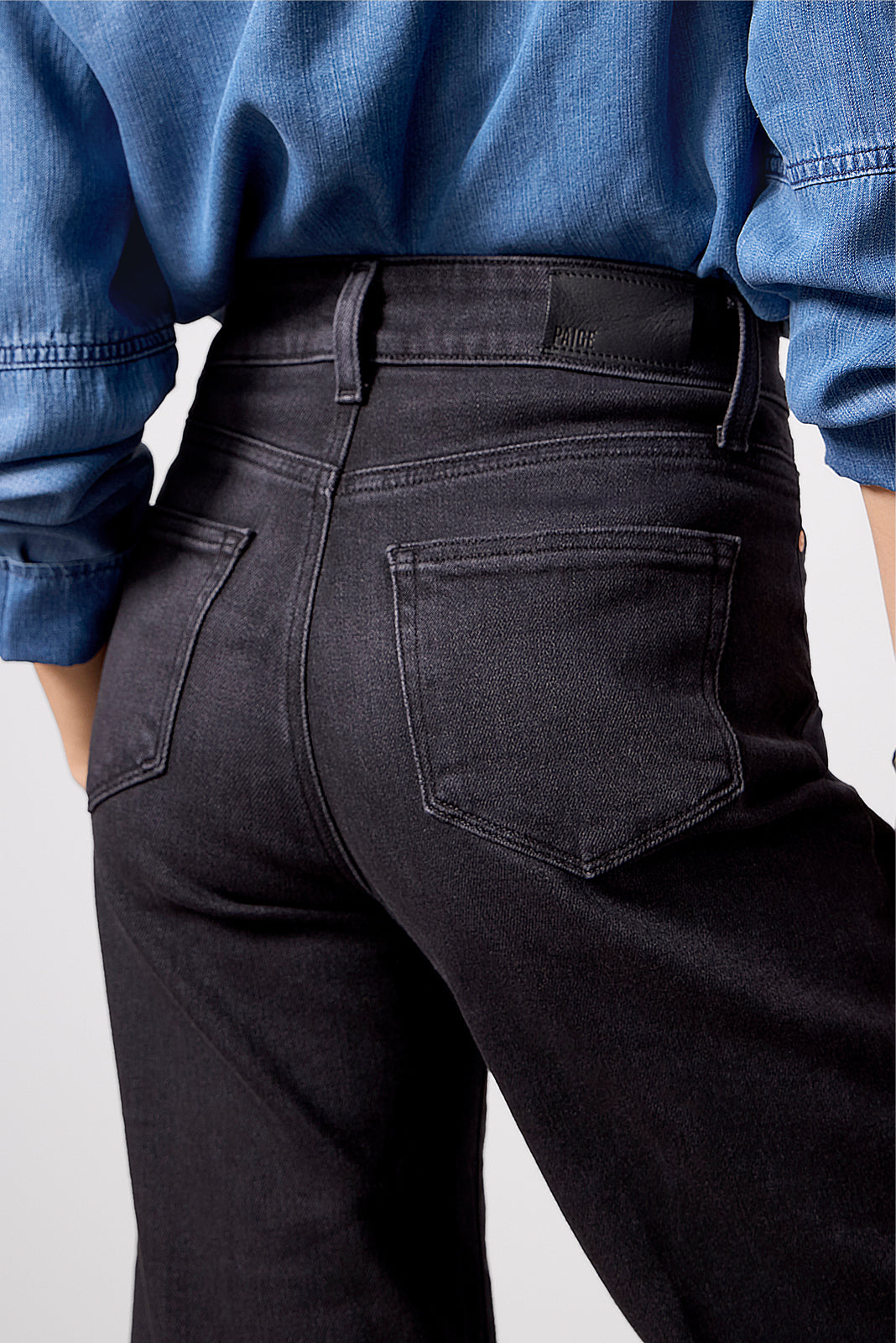 The wide leg jean you’ll be wearing on repeat. Designed with a petite 25 inseam and higher knee and mid-thigh placements. these Paige jeans are crafted in soft stretch denim with a flattering high-rise fit.?black wash. and ankle-length raw hems.