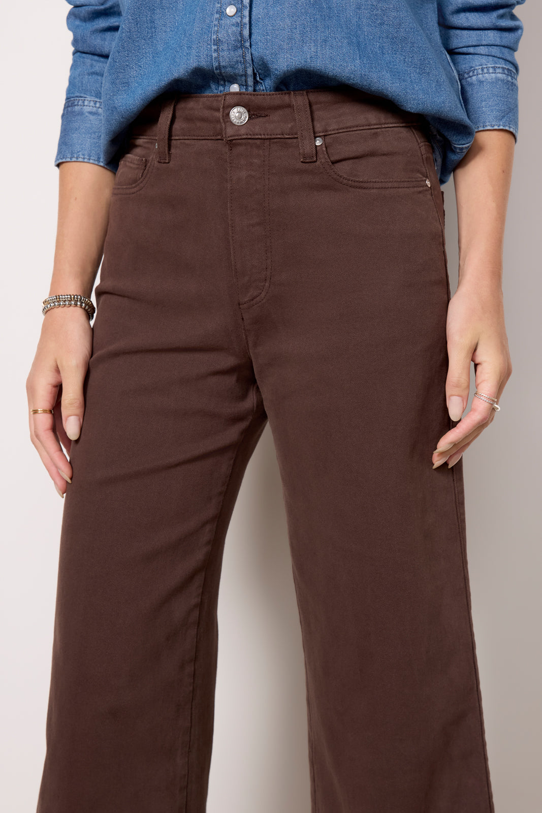 Perfect for dressing up or down. the Anessa Wide Leg pant by Paige is crafted in soft stretch denim and features a high-rise waist. classic 5-pocket styling. and ankle-length hems. The rich brown hue makes them a must-have for fall.