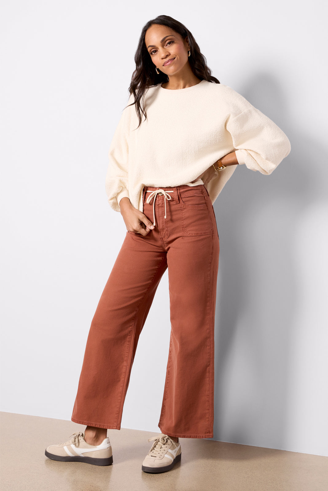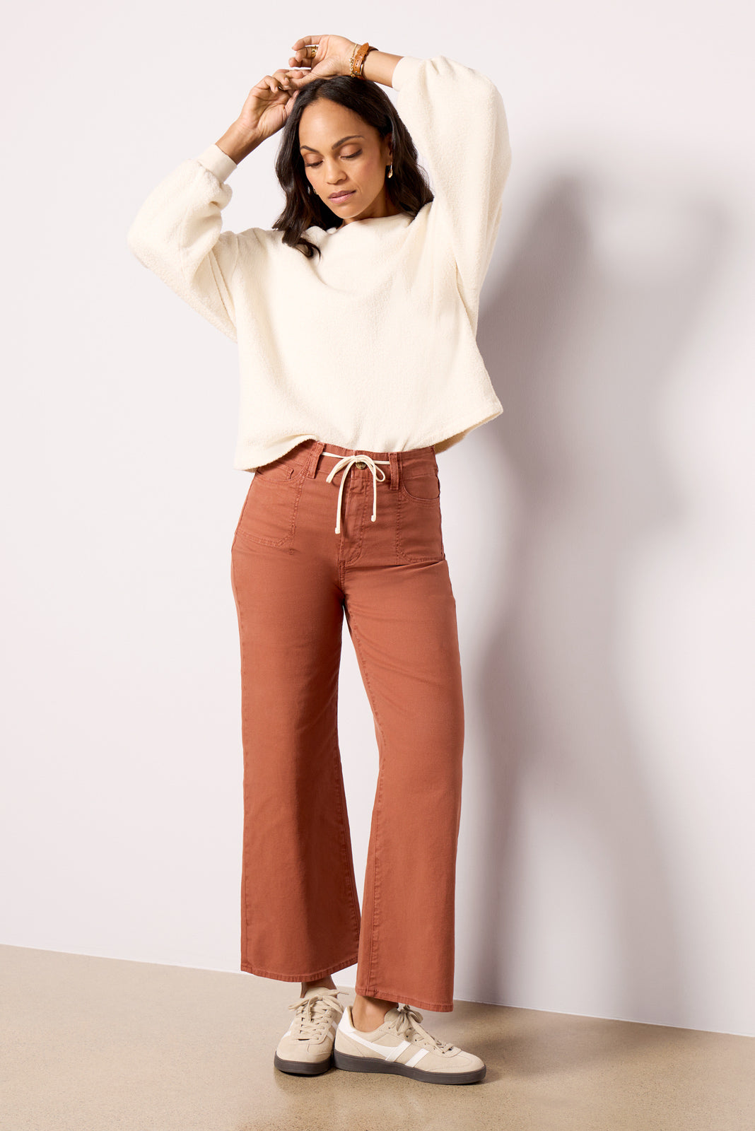 Crafted in soft twill fabric. these stylish wide leg pants by Paige will instantly elevate your wardrobe. featuring a full-length inseam. patch pockets. and a high-rise waist with an adjustable tie.