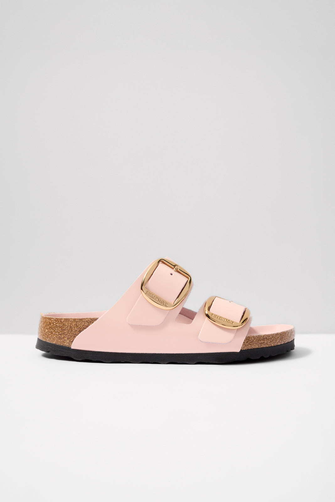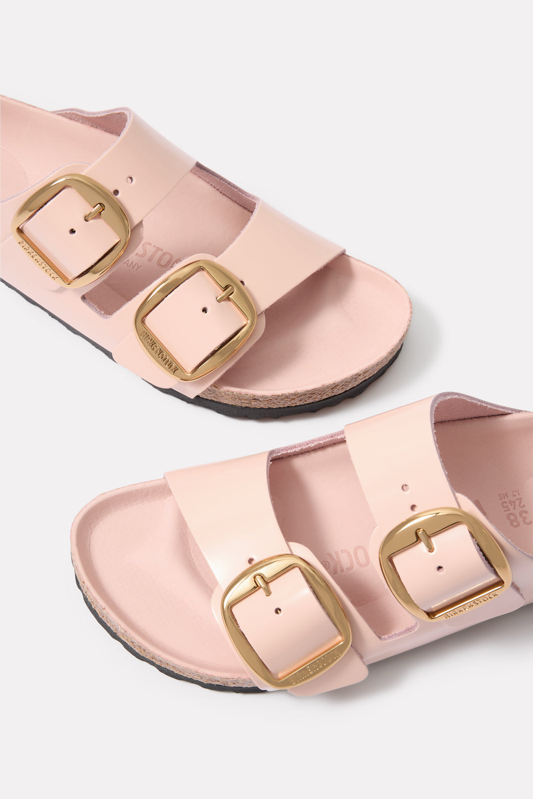 Bold gold-tone buckles update these iconic Arizona sandals by Birkenstock. featuring pink leather straps in a shiny patent finish.