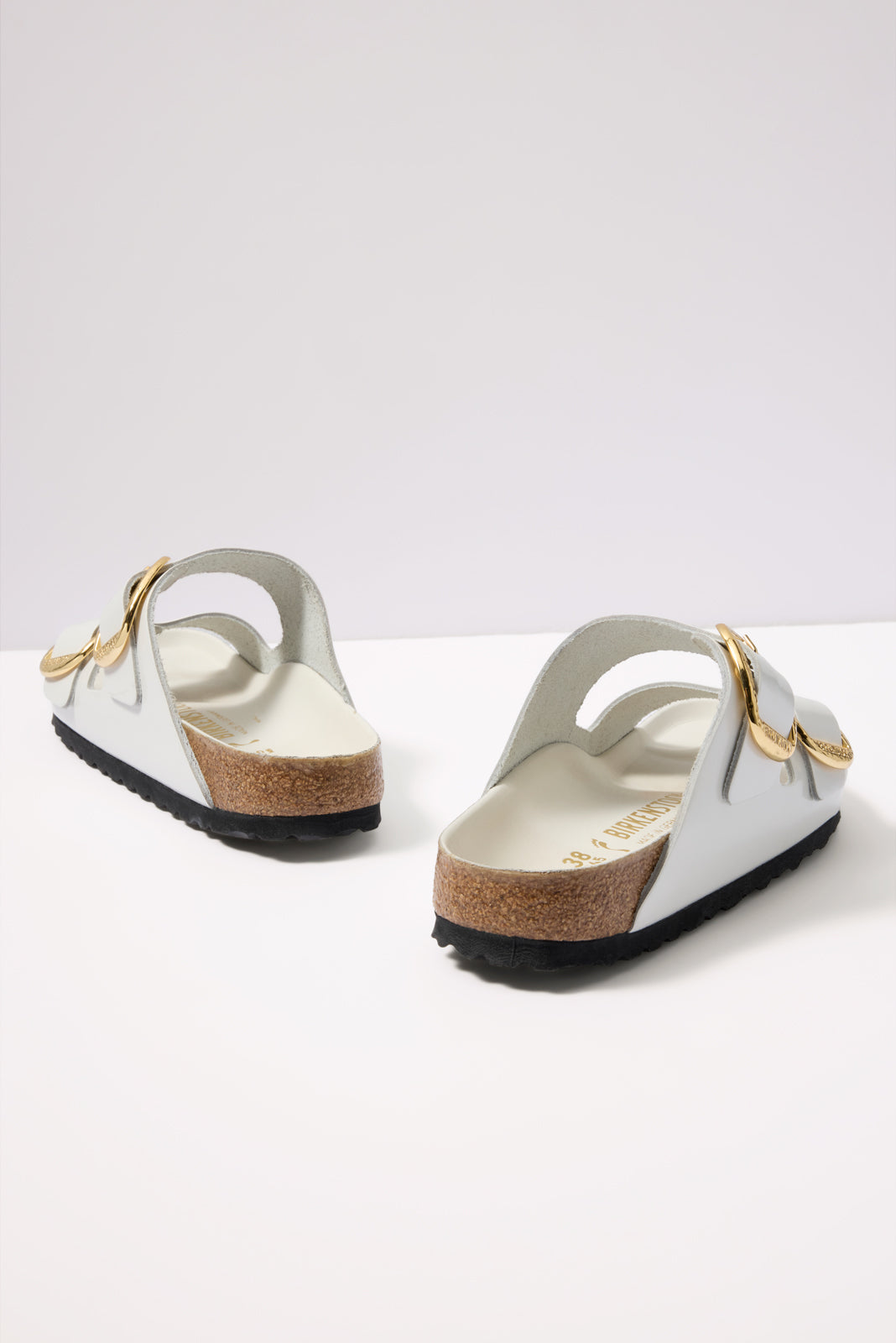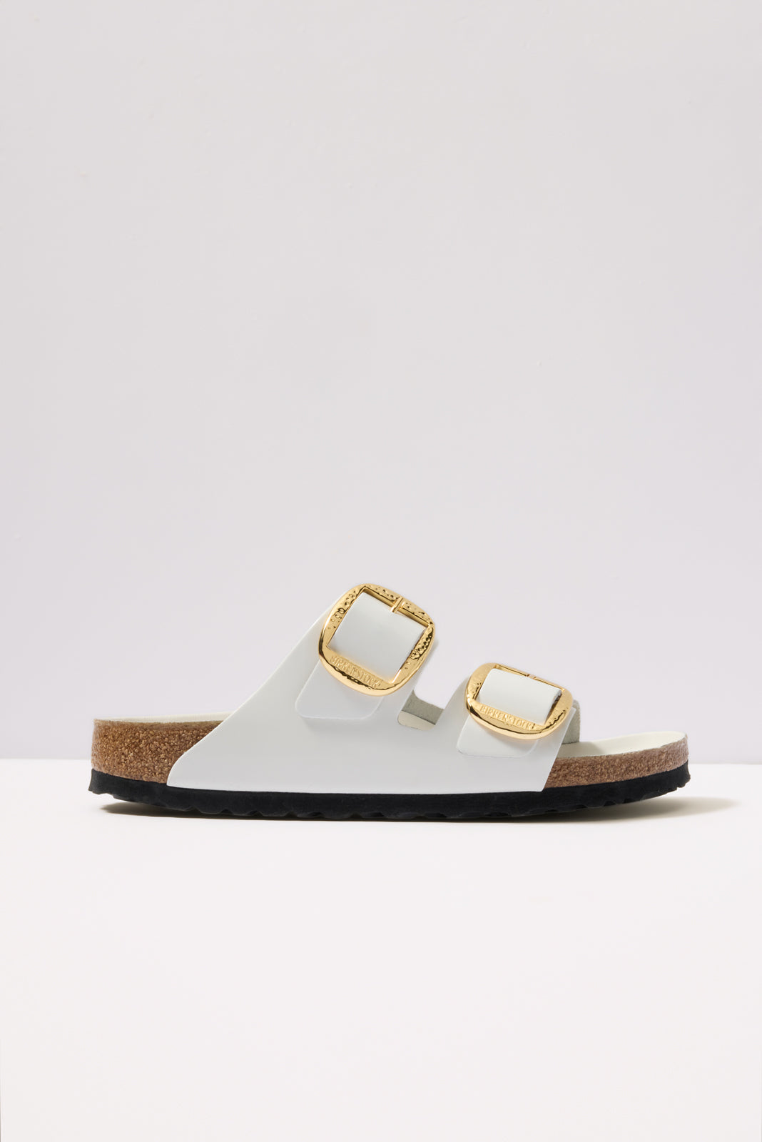 Hammered gold-tone buckles update these iconic Arizona sandals by Birkenstock. featuring white leather straps in a shiny patent finish.