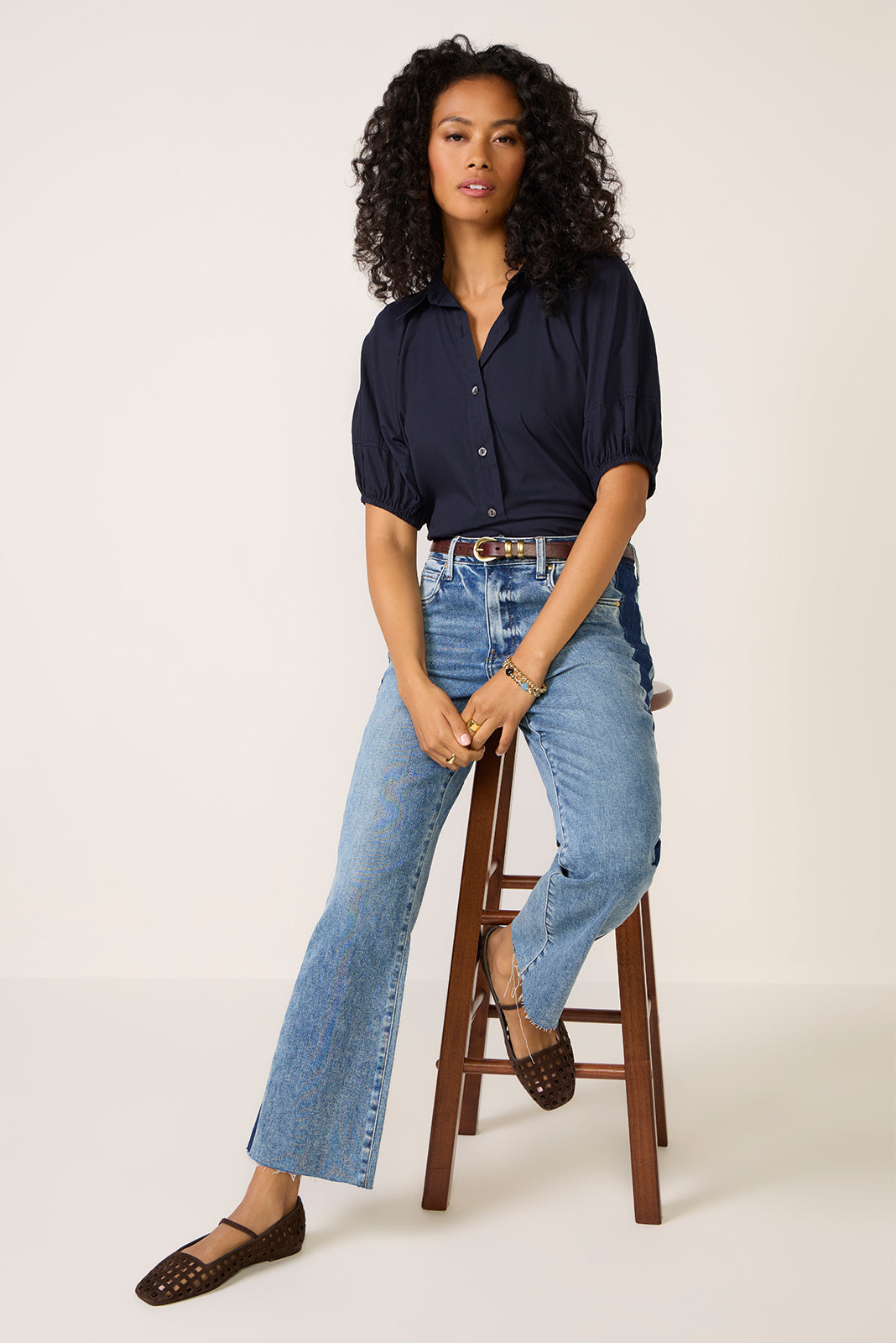 Crafted in a light cotton poplin. the Autumn Blouse by Velvet features a point collar. front button closures. short sleeves with elastic cuffs. and a relaxed silhouette.