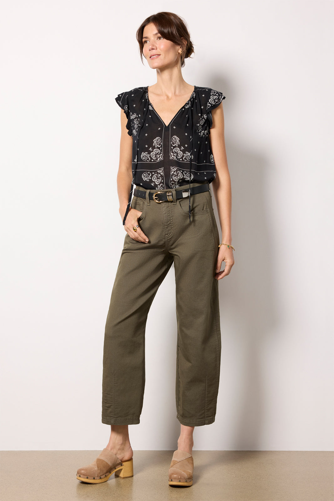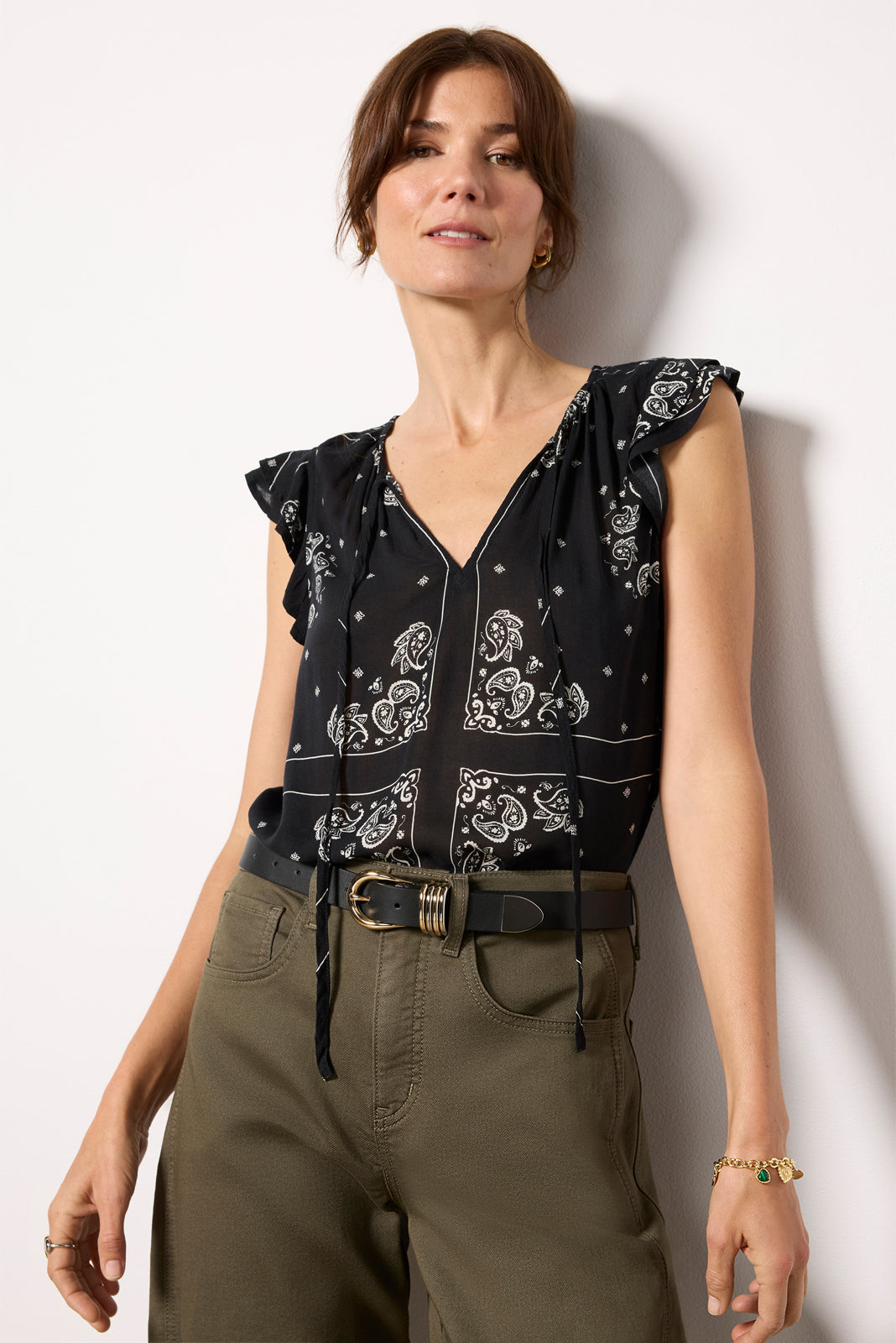 Elevate your day-to-night wardrobe with the Bandana Print Tank by Cloth?& Stone. crafted from lightweight woven fabric with ruffled shoulders. a curved hem. and a v-neckline with tie details.