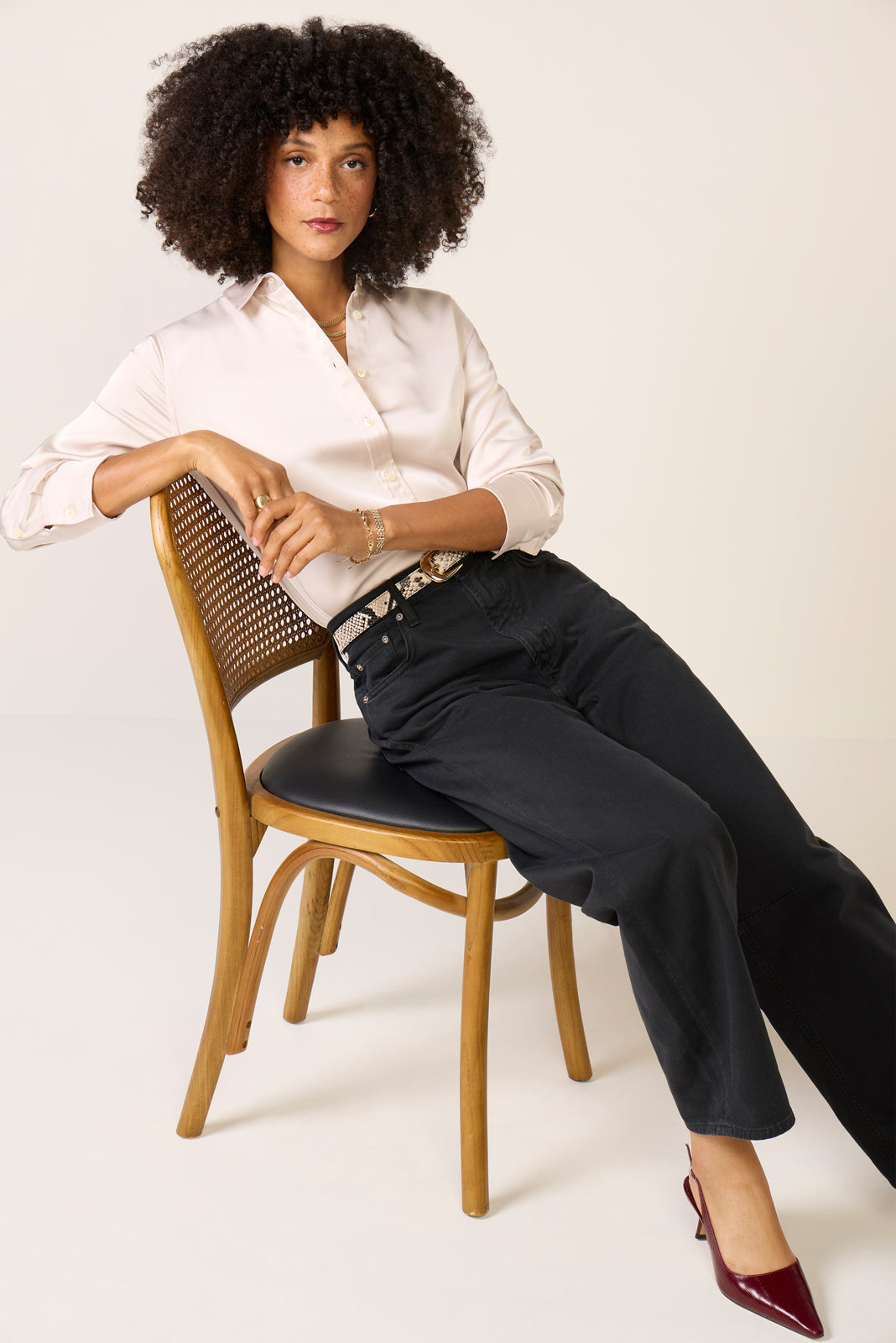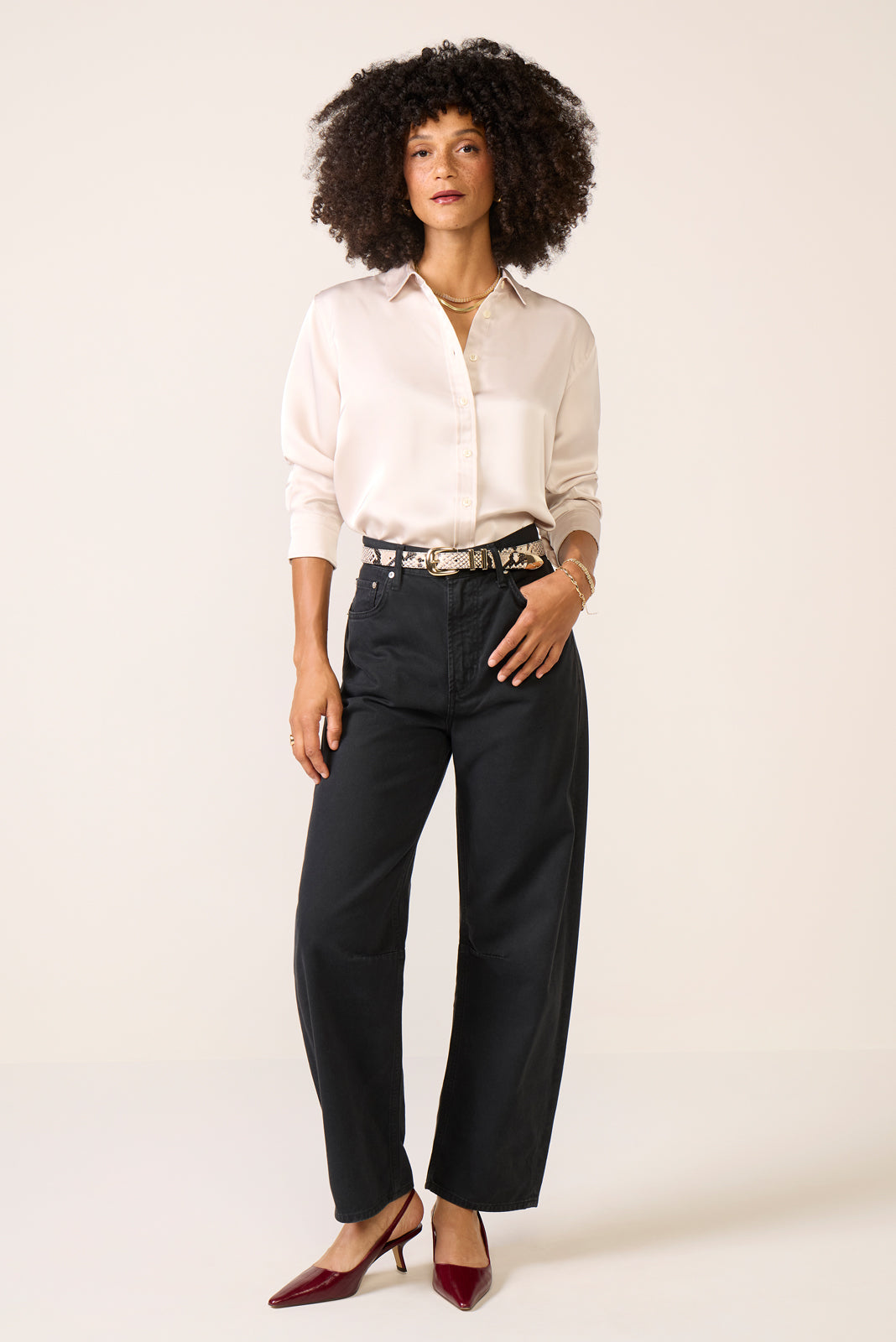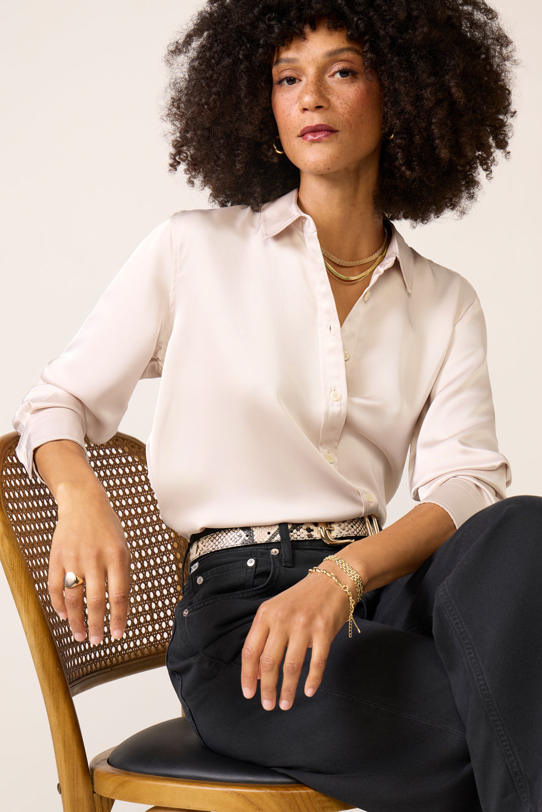 Finished in silky smooth fabric with a beautiful drape. this Spanx button-down shirt will take you from office to evening with ease. The Better Than Silk Top features a relaxed silhouette with a curved hemline. front button closures. and long sleeves.