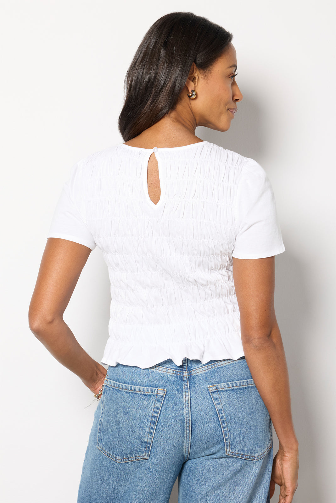 A fitted smocked?bodice creates the flattering silhouette of the Better Together top by Sanctuary. Perfect for spring. this stylish top is finished in organic cotton fabric with short sleeves. a back keyhole button closure. and a cropped. ruffled hem.