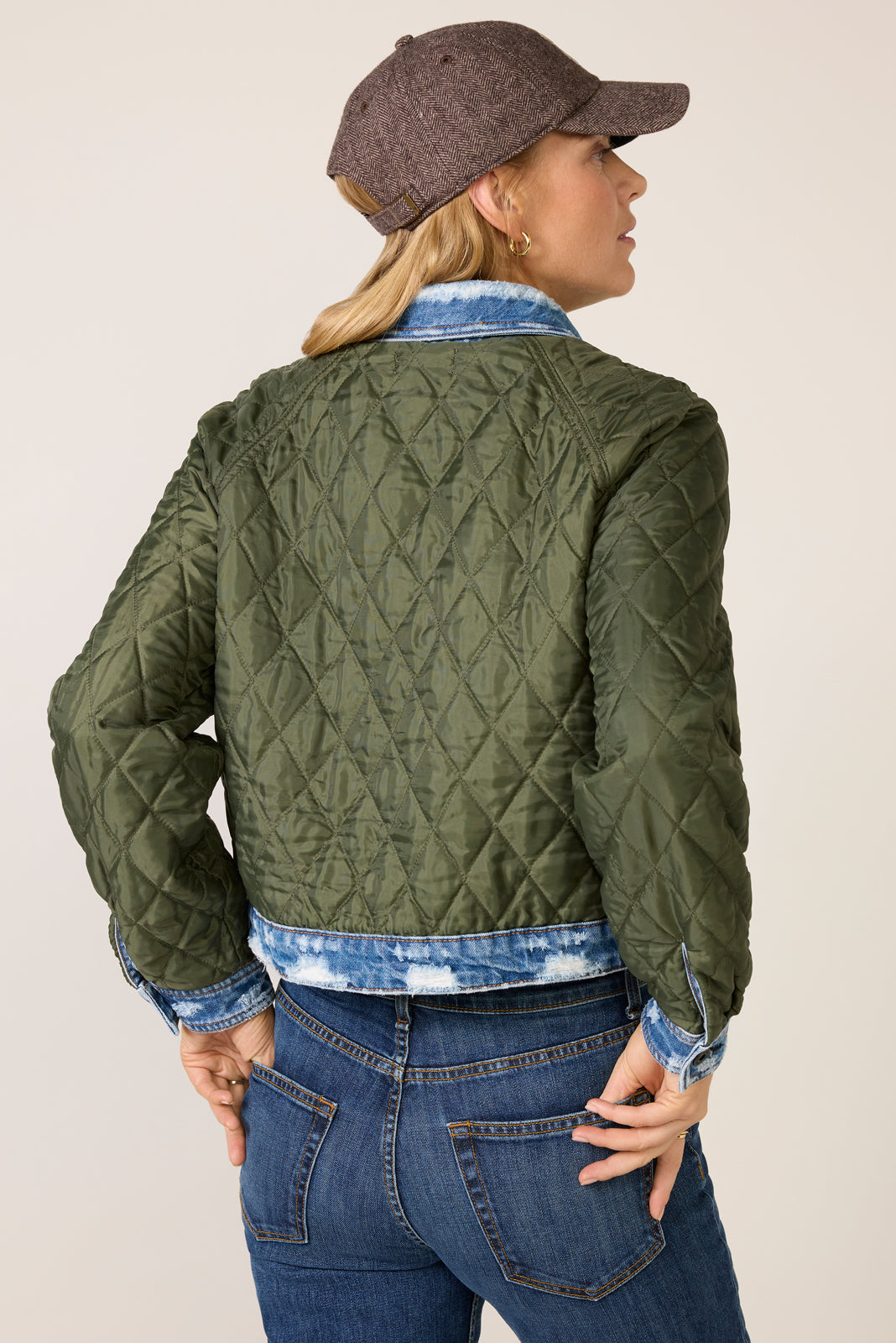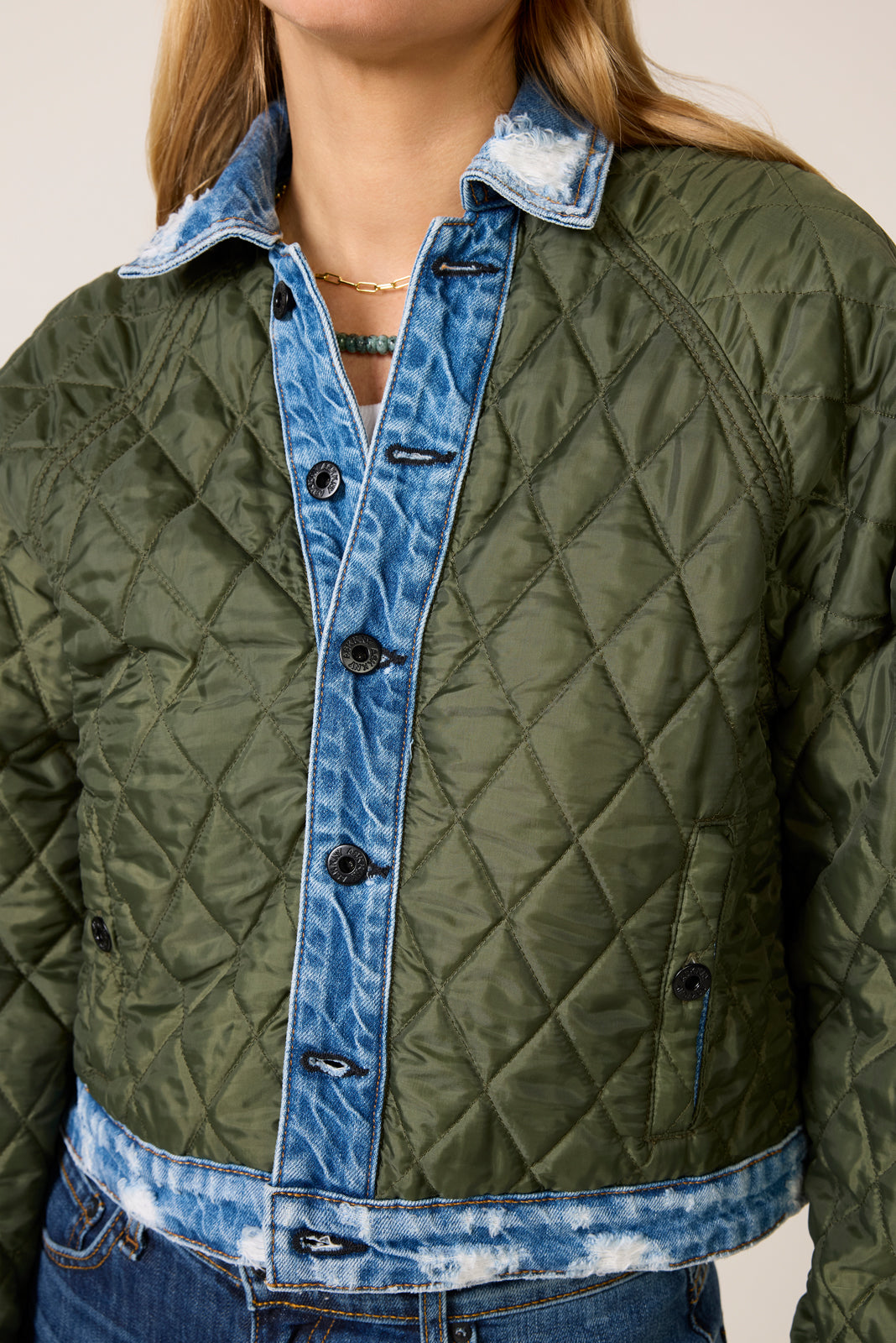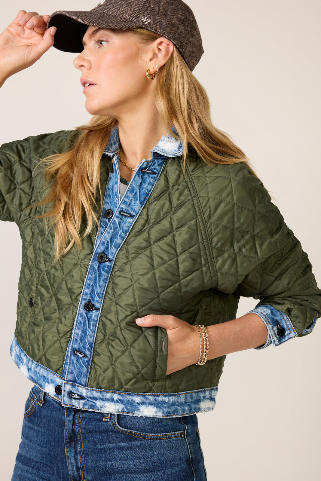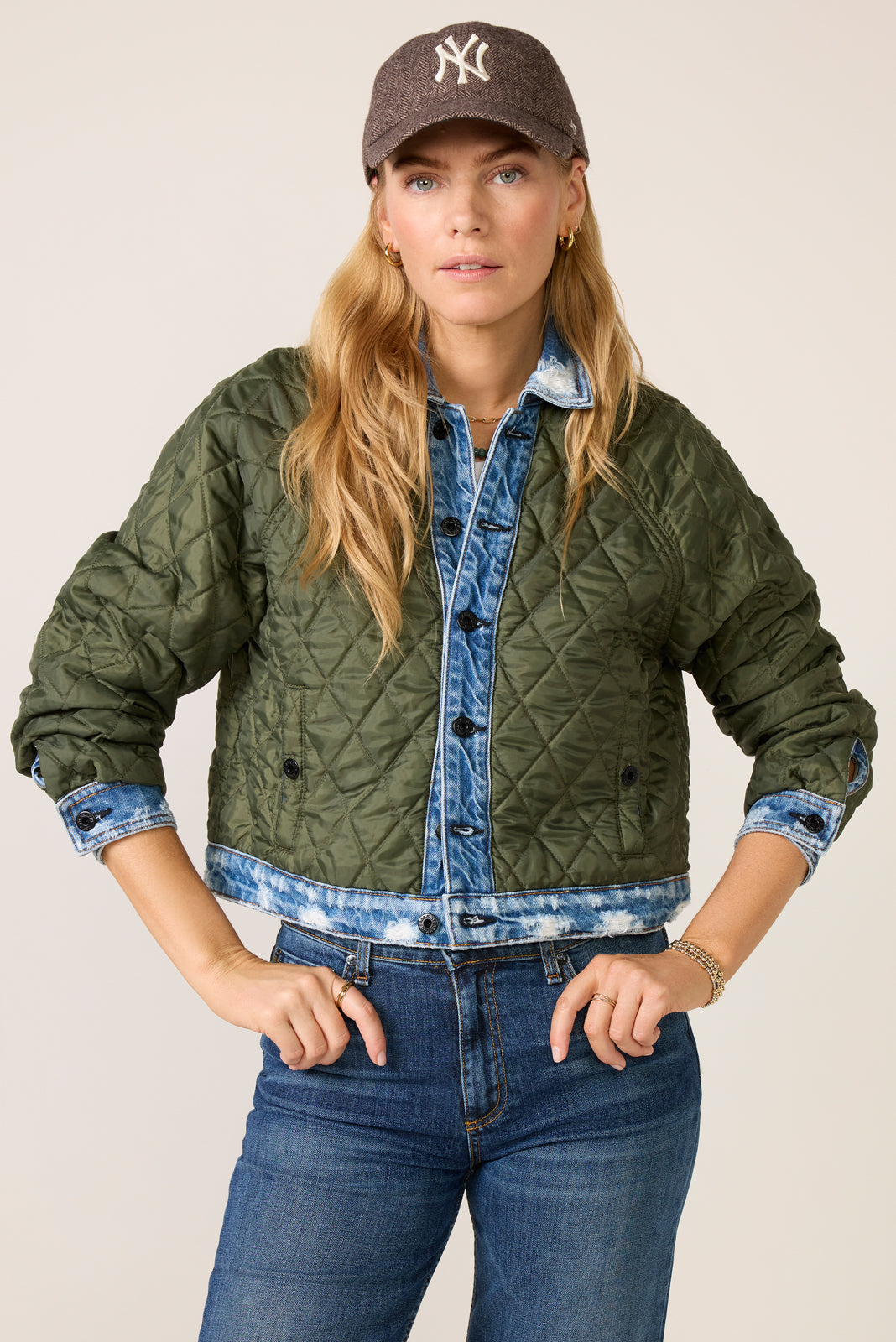 Denim detailing defines this lightweight quilted jacket by ASKK NY. featuring front button closures and a cropped silhouette that’s perfect for throwing over all your favorite looks.?