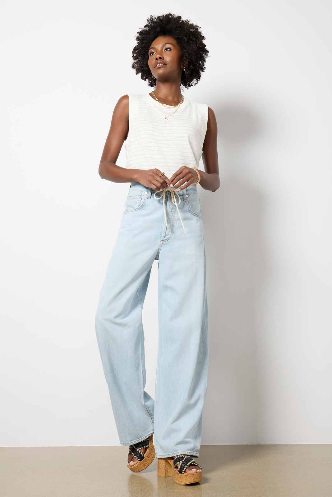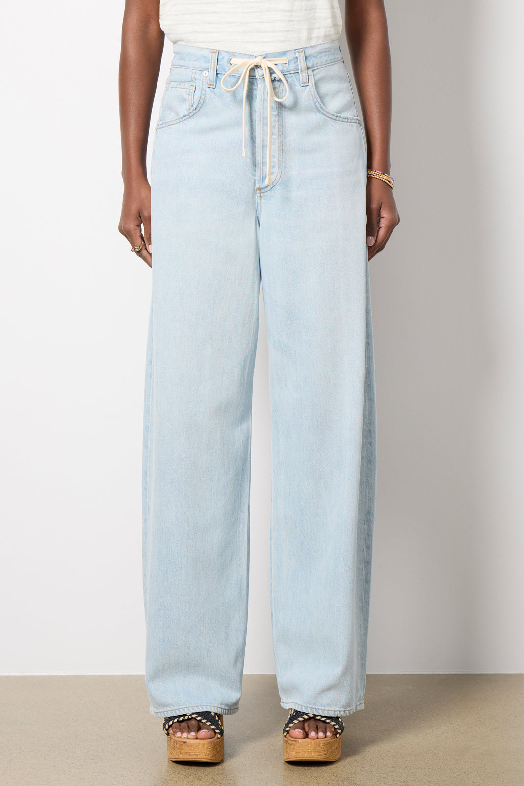An adjustable drawstring waist details these versatile trouser jeans by Citizens of Humanity. These?wide leg jeans feature a relaxed silhouette with a button fly closure. high-rise waist. and full-length inseam.?