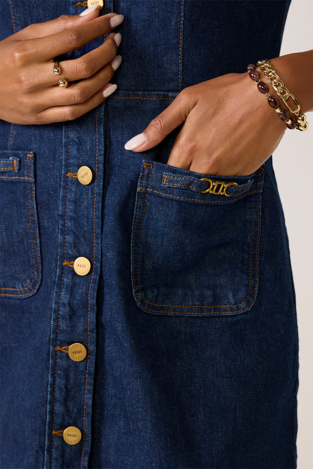 Refresh your fall denim collection with the Clementine Dress by Paige. Finished in a dark blue wash. this denim mini dress?is crafted from soft organic cotton-blend?stretch denim and features a defined waist. front button closures. and patch pockets with gold hardware details.
