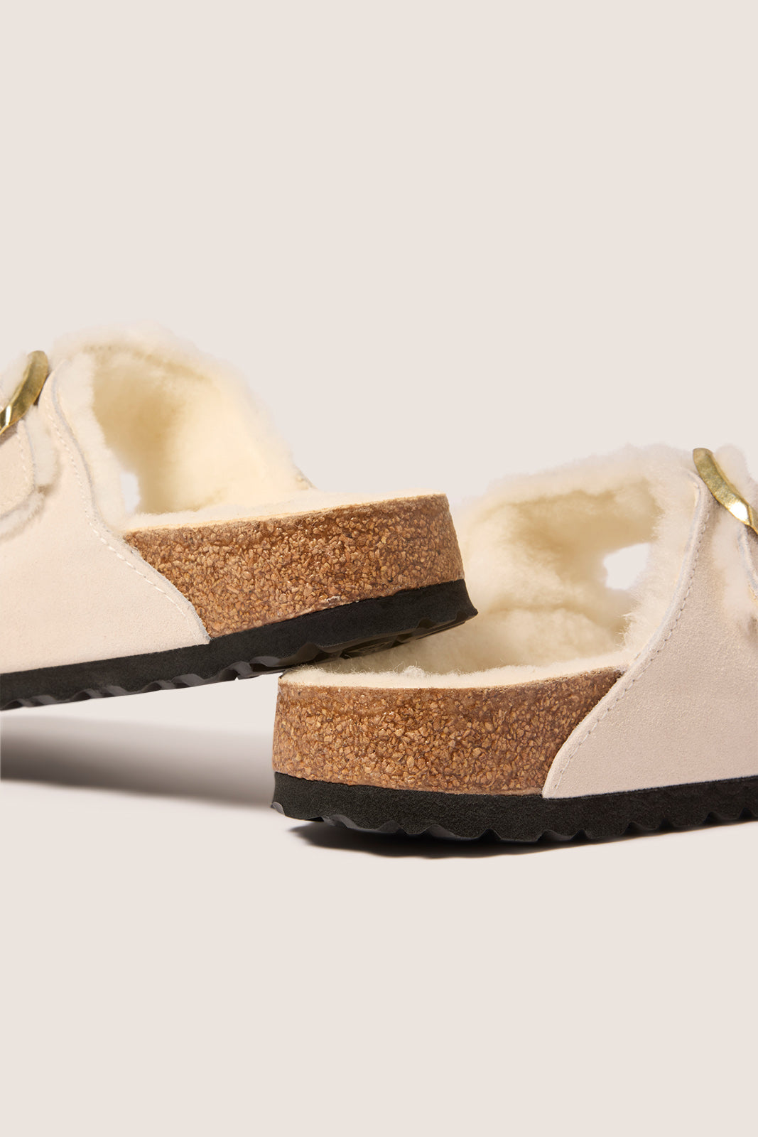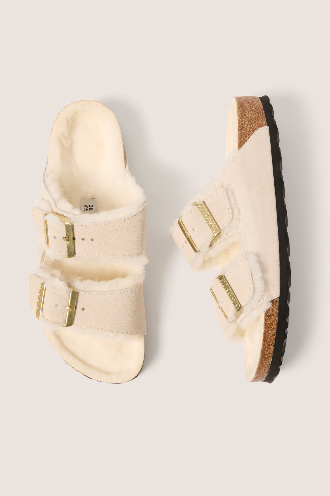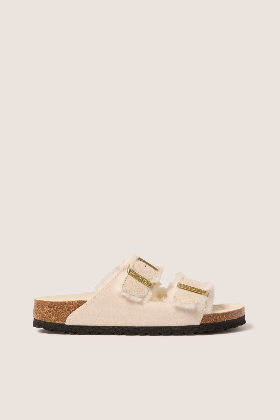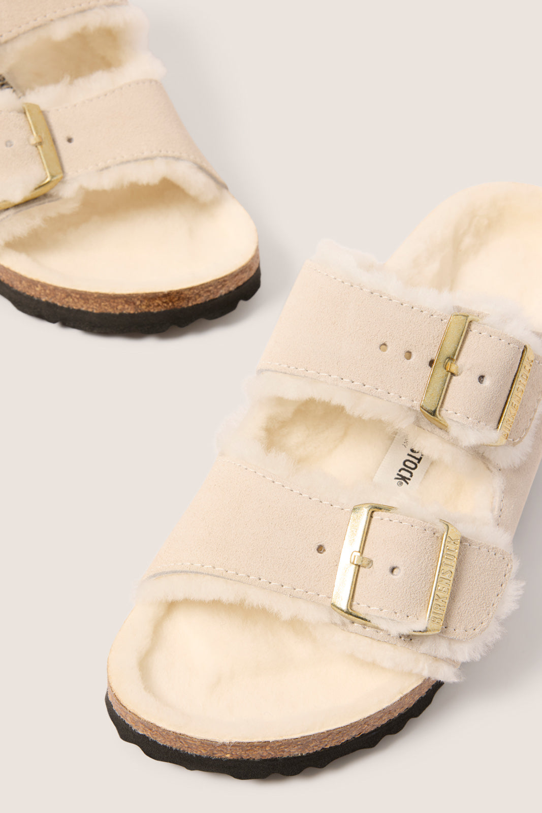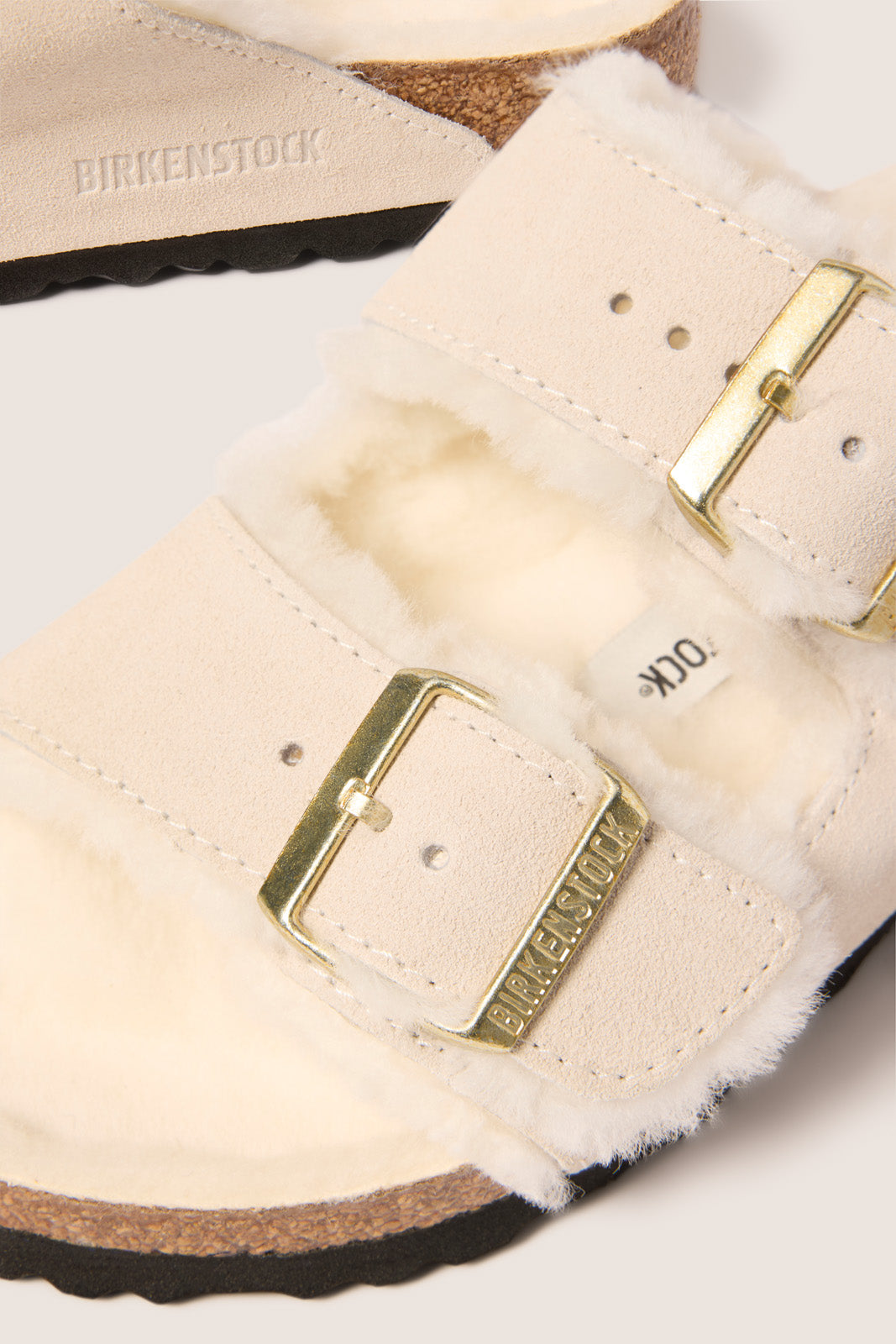 Lined with cozy shearling for colder months. these iconic Birkenstock Arizona sandals feature a comfortable contoured footbed and suede straps with gold-tone buckles.