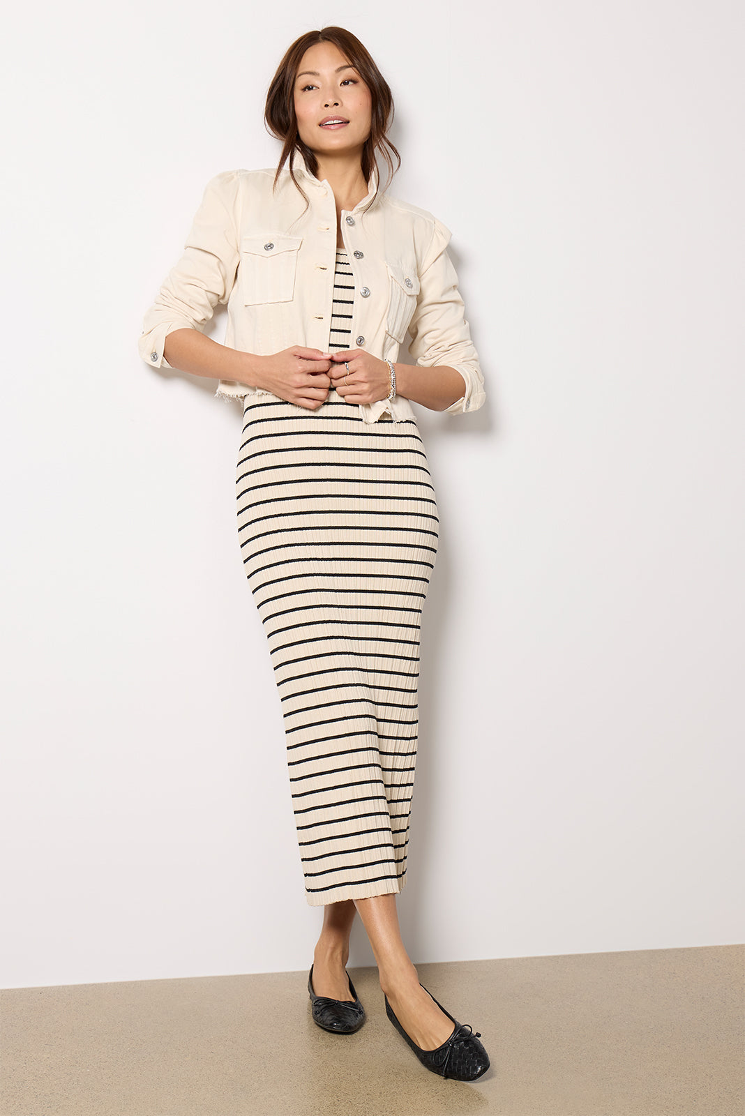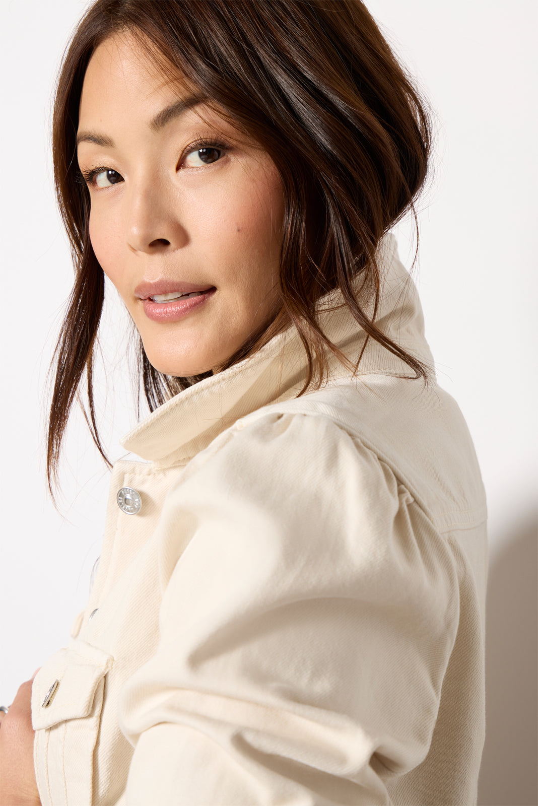 A classic denim jacket with an edgy. feminine feel. the Pacey by Paige features a cropped silhouette with a raw hem and button-front closure. The soft beige wash makes it the perfect addition to your layering collection.