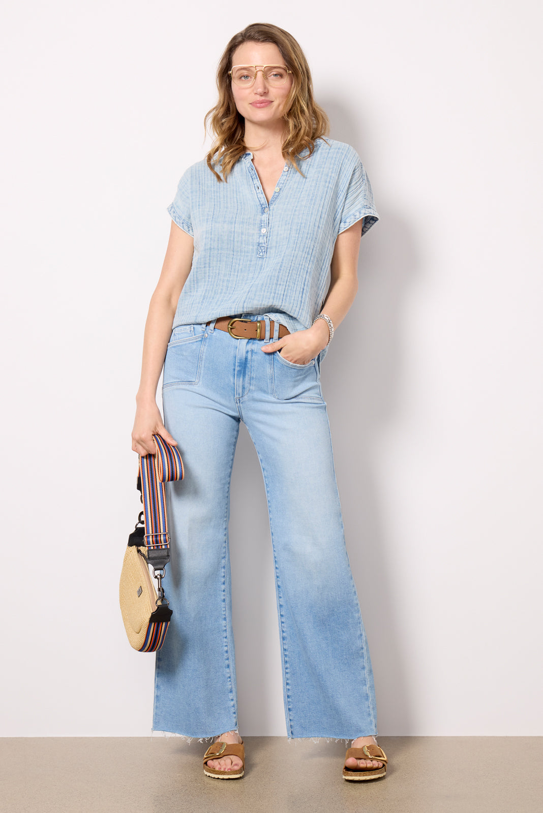 Crafted from organic cotton gauze. this breezy Faherty blouse?is perfect for spring-to-summer wardrobe. featuring?a half button placket. banded collar. and easy. relaxed fit that can be dressed up or down.