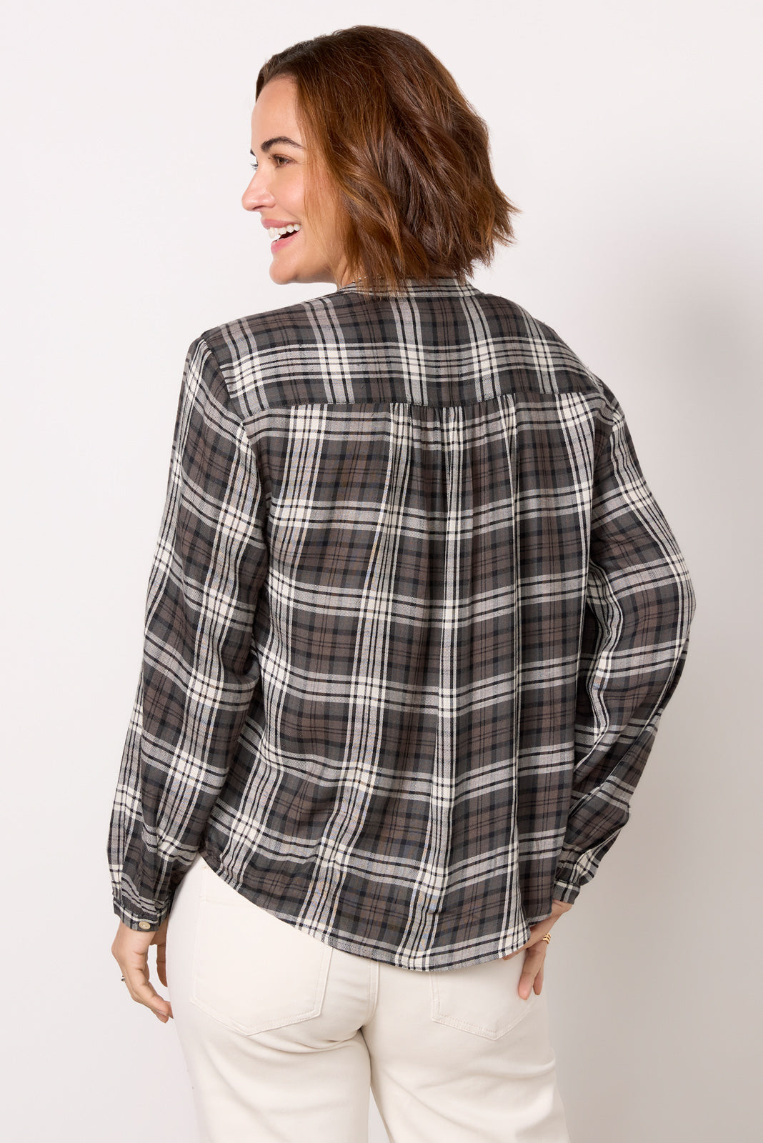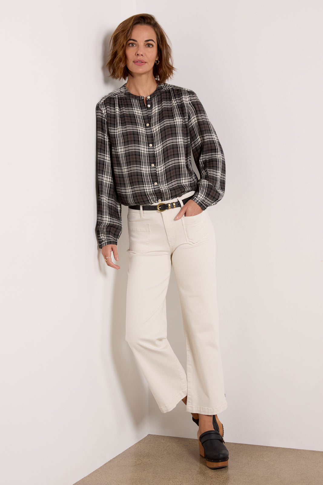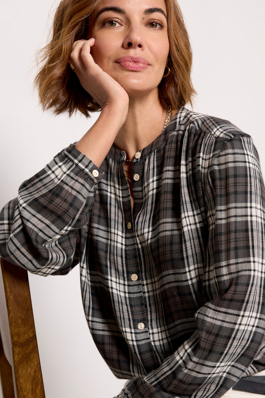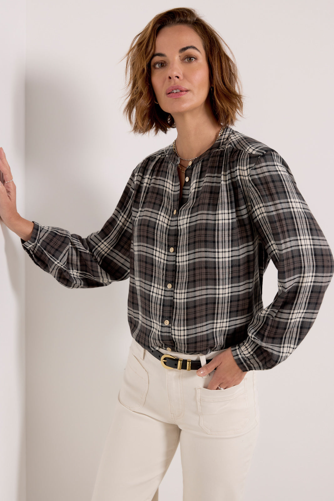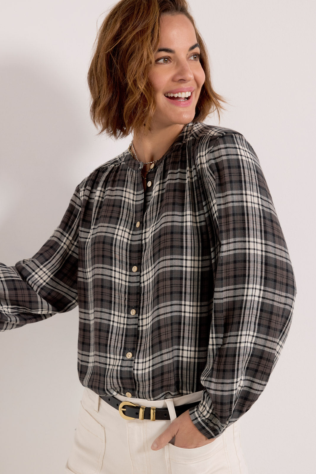 Step into fall with the perfect blouse from Faherty. featuring a mandarin collar with shirring details. smocking on the sleeves. and front button closures.?