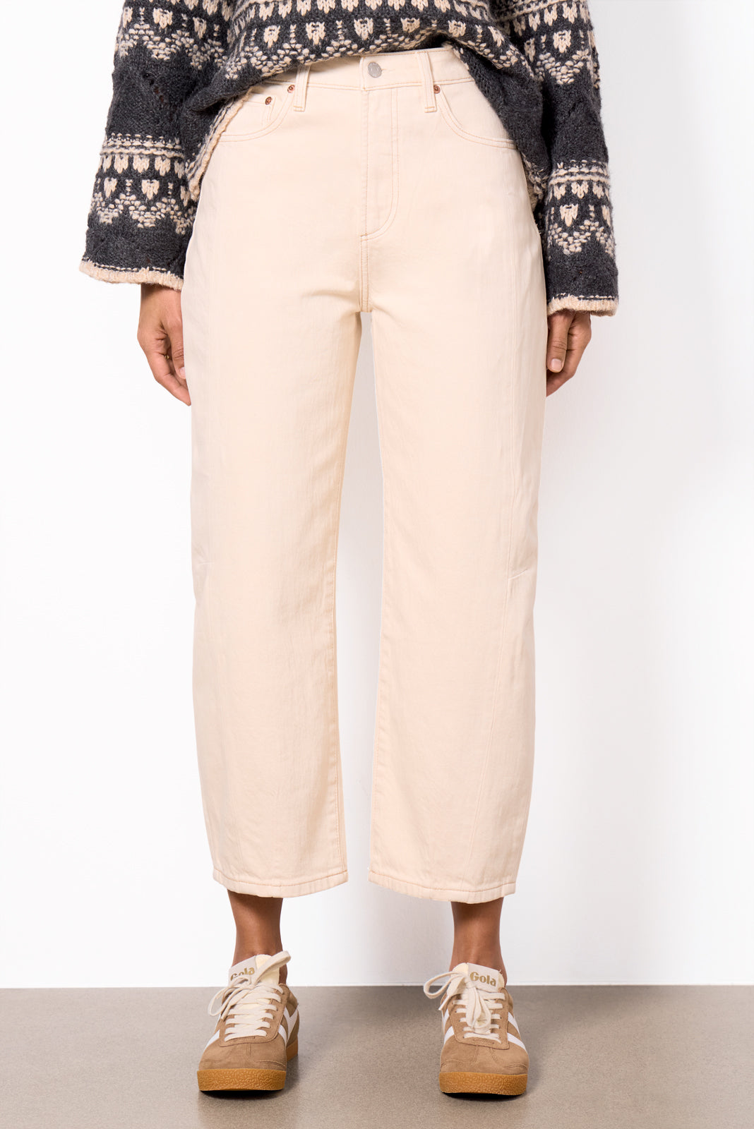 Finished in a cream wash. the?Eli Arched Leg jean by Pistola is crafted in comfort-stretch denim and features a modern barrel silhouette achieved through a subtle bowed shape and relaxed. high-rise fit.