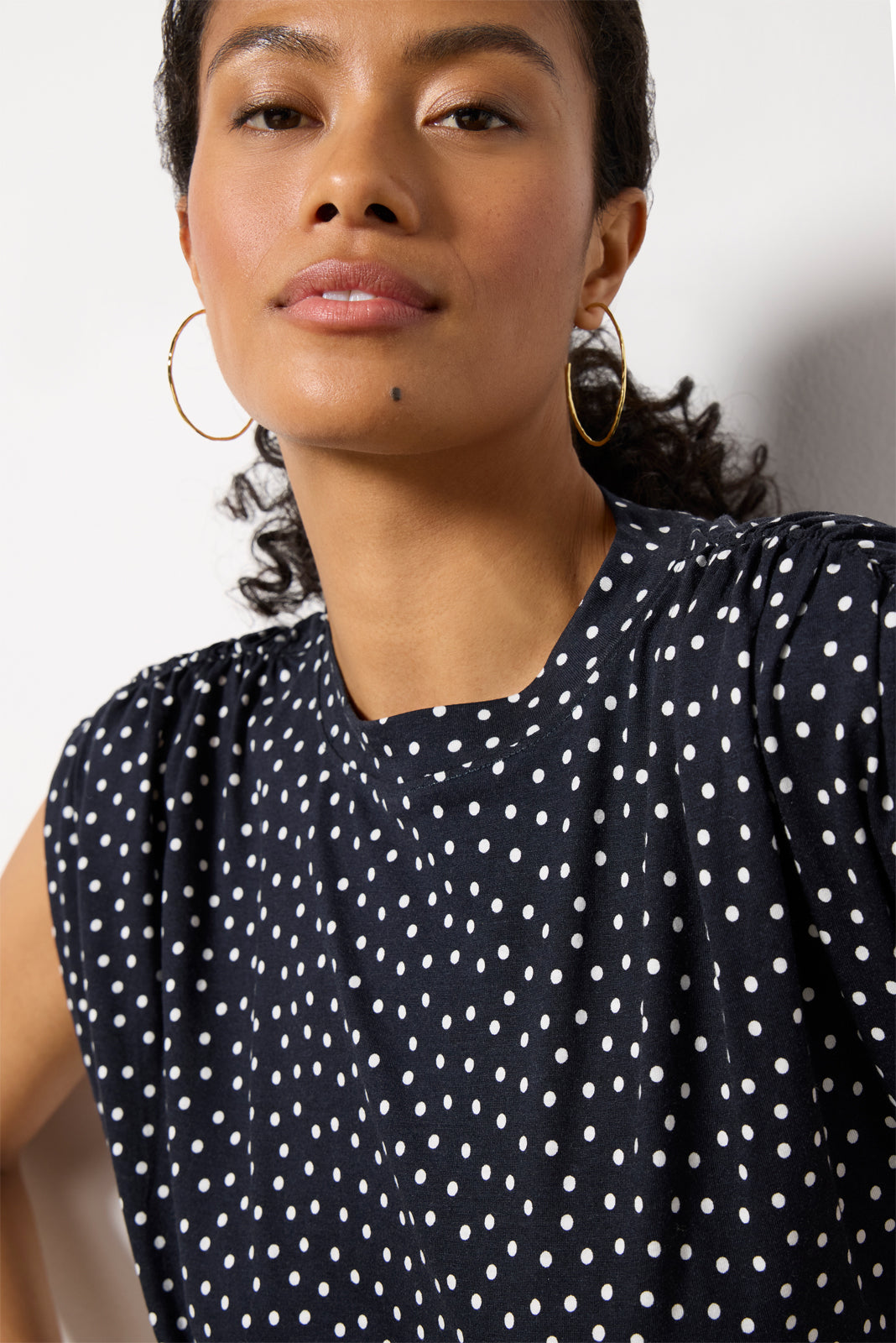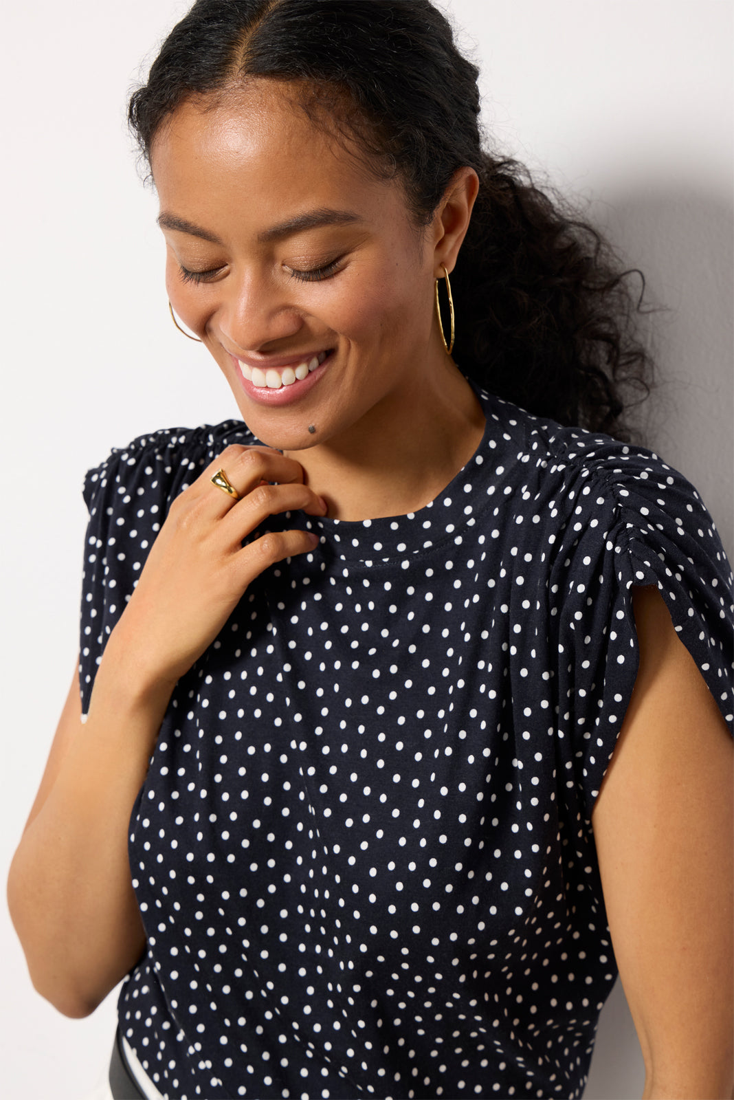 A shirred shoulder detail and fun print come together in this elevated muscle tee by Nation Los Angeles. crafted in a soft blend of Tencel and Pima cotton.