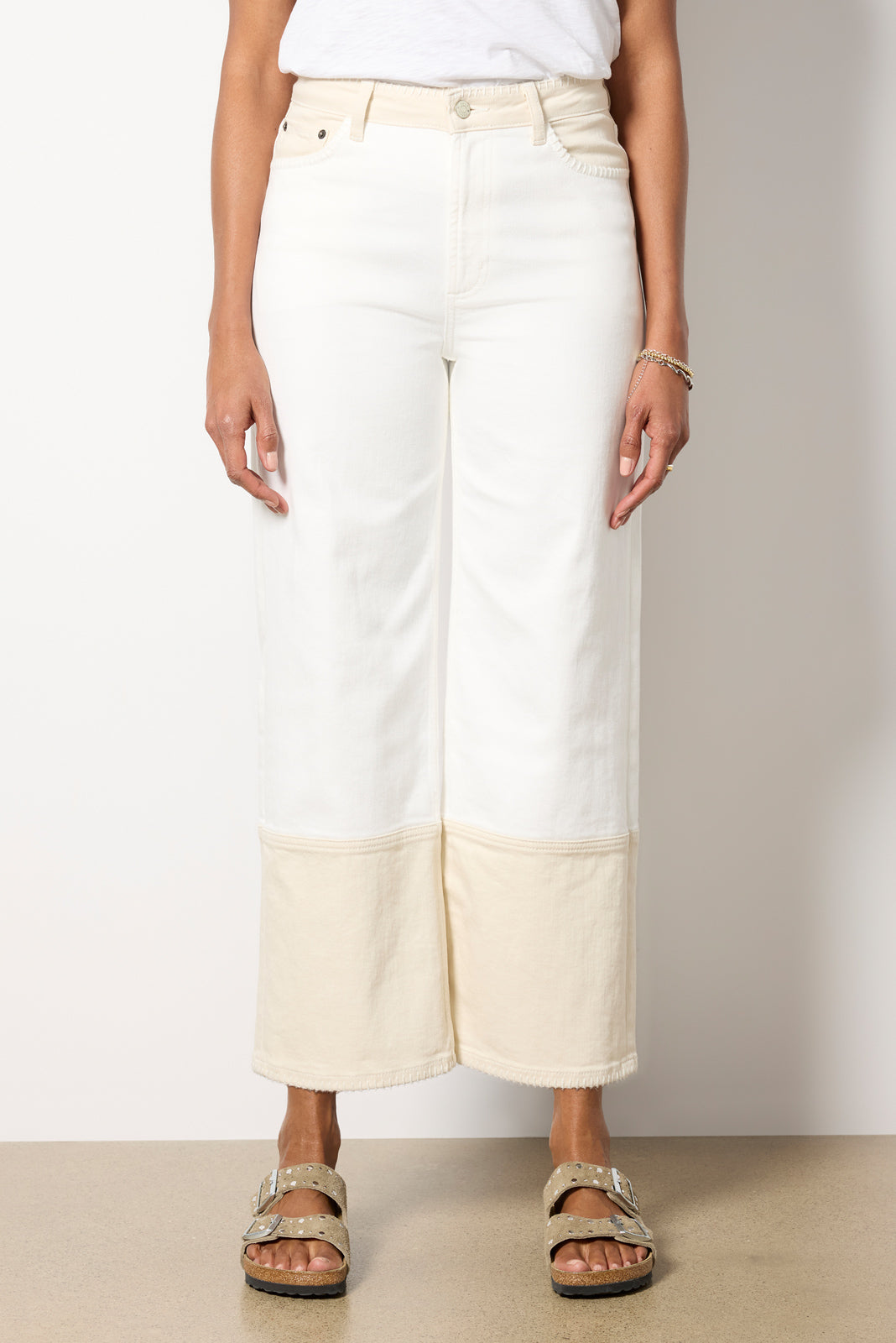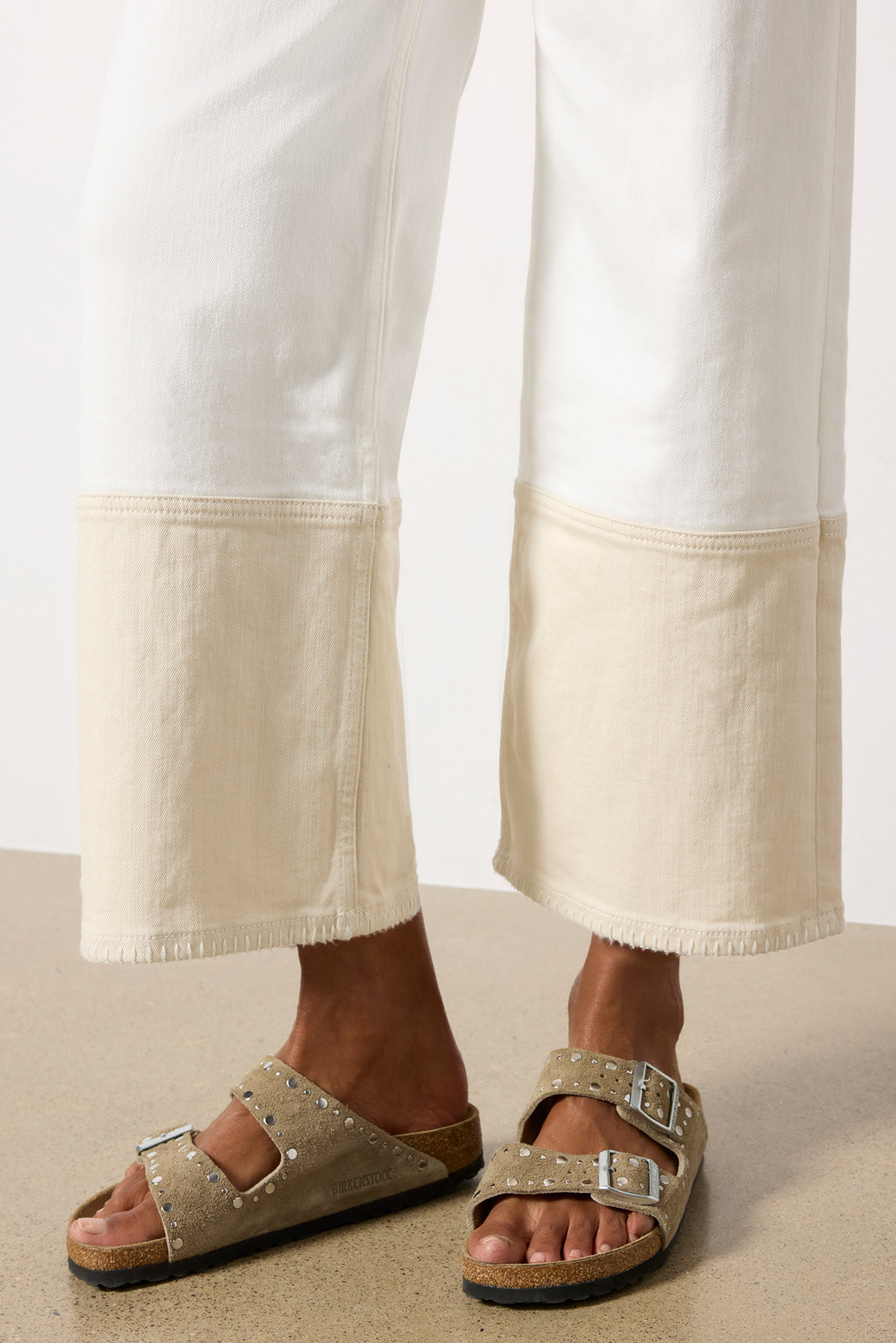 Embroidered trim and a two-tone design add interest to these chic wide leg jeans by Rails. featuring a?flattering high-rise fit. light-stretch denim. and clean hems cropped at the ankle.