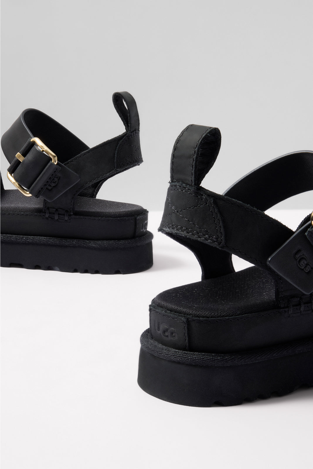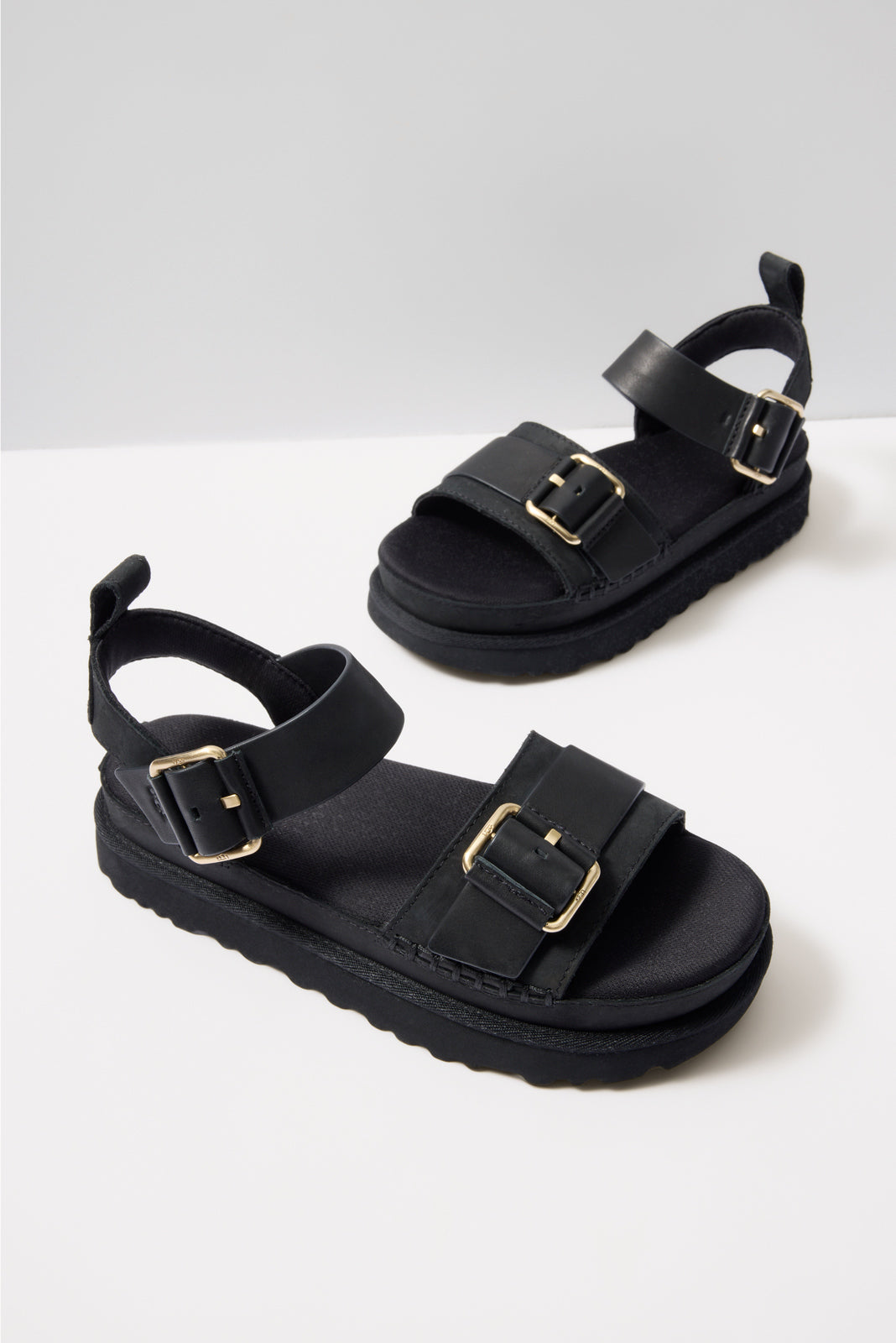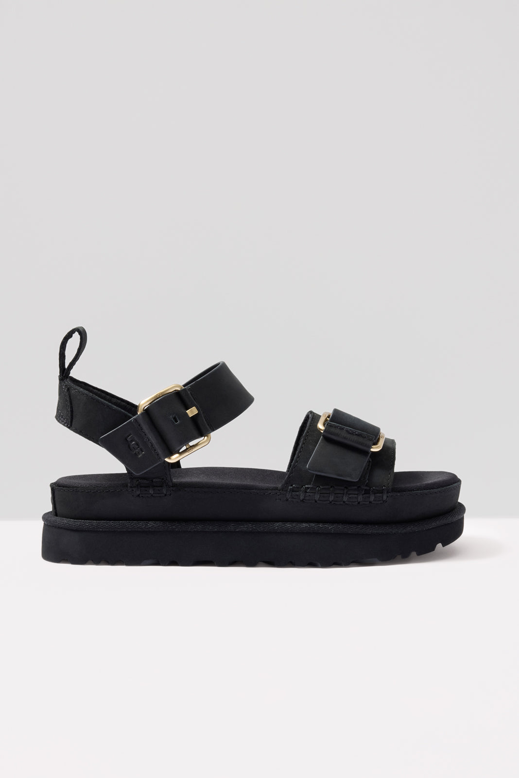 The Goldenstar Villa by UGG® will instantly elevate any warm-weather look. Finished with soft Nubuck and genuine leather straps. these stylish platform sandals feature buckle details. whipstitch binding. and a contoured footbed for all-day comfort.