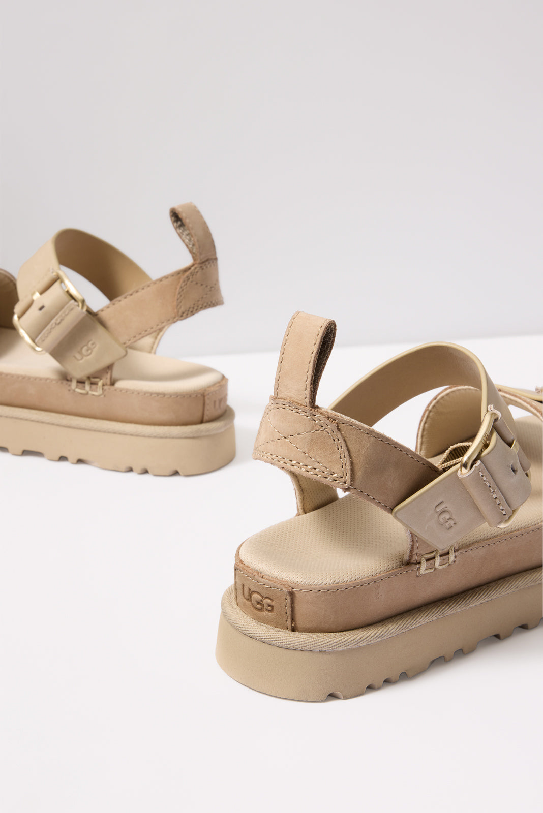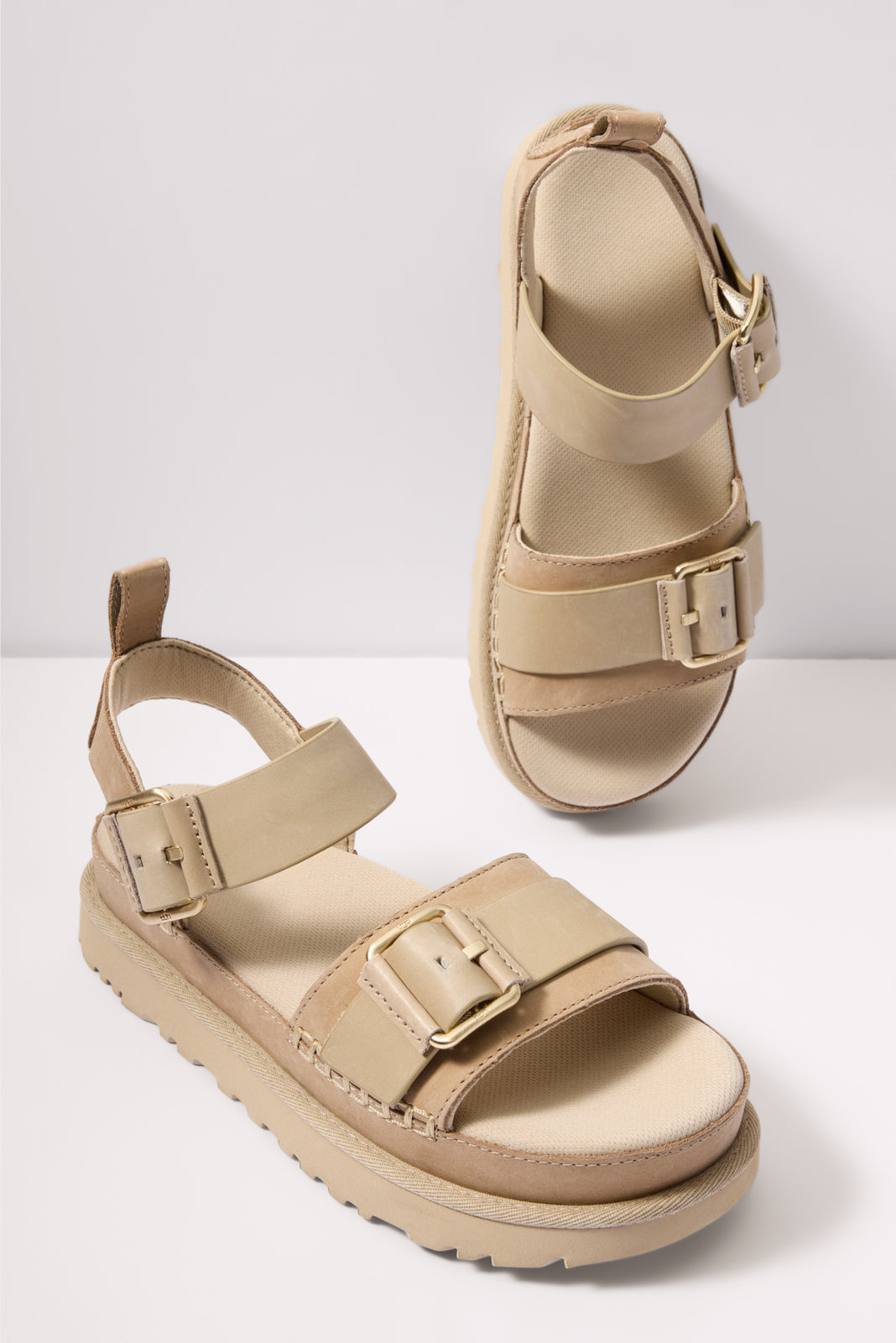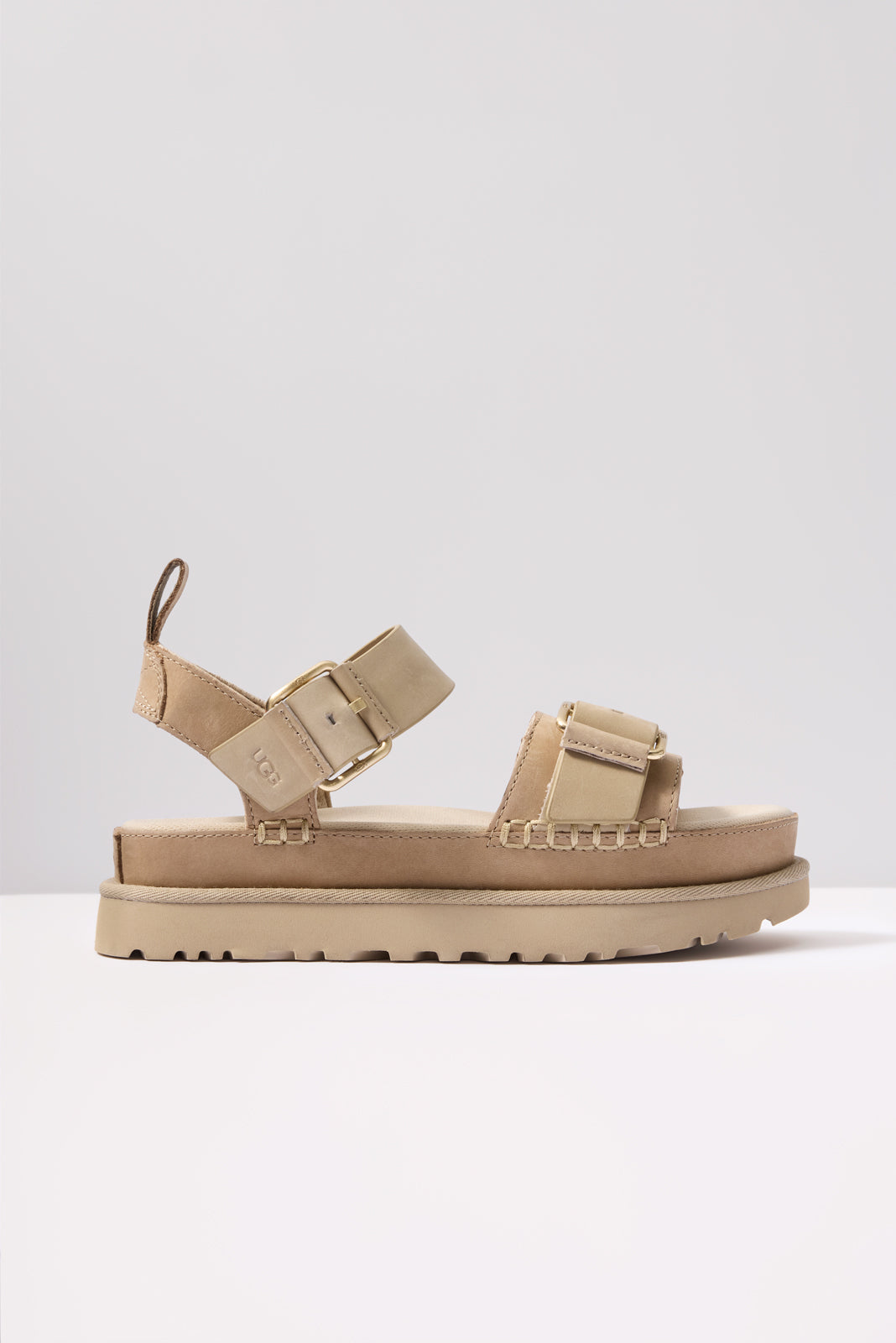 The Goldenstar Villa by UGG® will instantly elevate any warm-weather look. Finished with soft Nubuck and genuine leather straps. these stylish platform sandals feature buckle details. whipstitch binding. and a contoured footbed for all-day comfort.