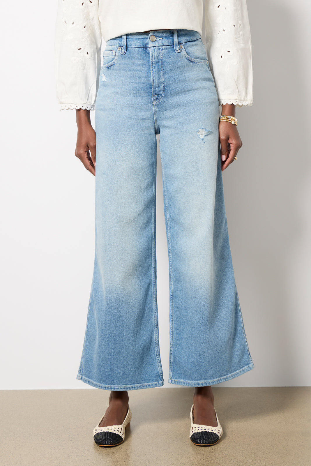 Crafted in a soft stretch denim. the Good Skate Crop features a high-rise fit. a light blue wash with subtle distressing. and a relaxed. wide-leg silhouette.?