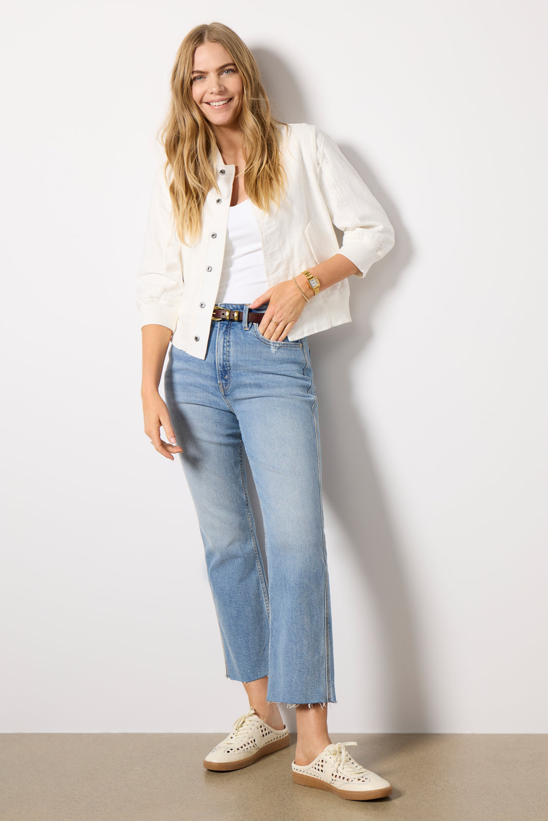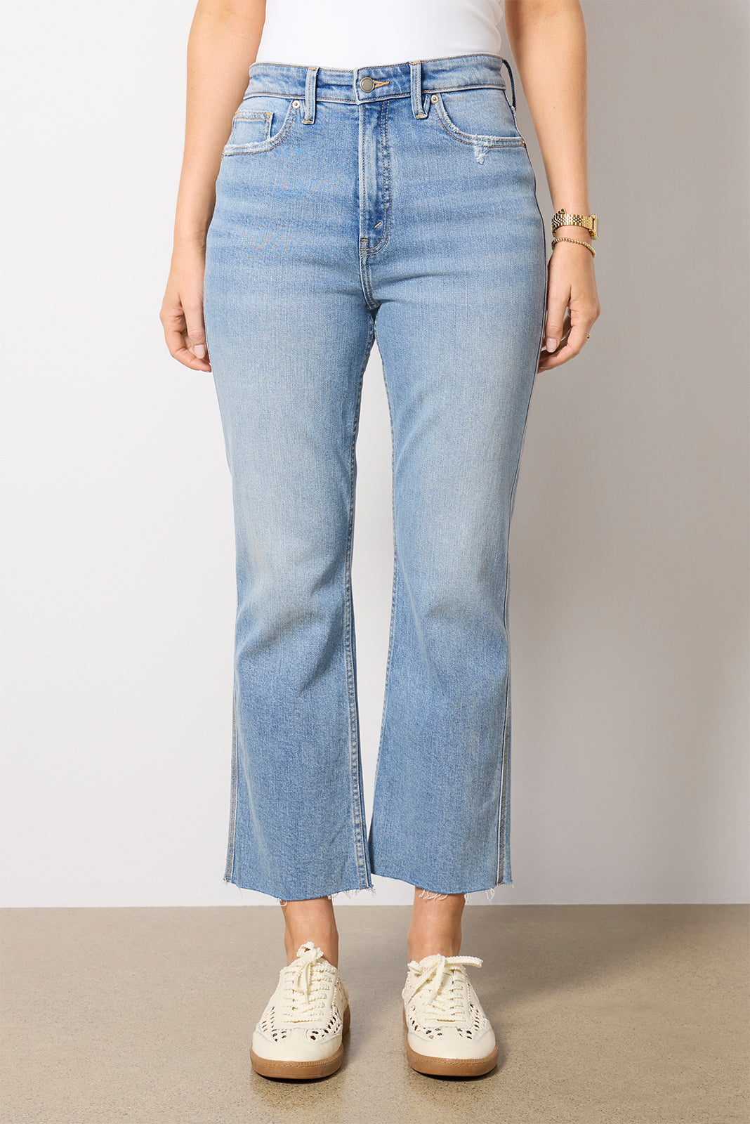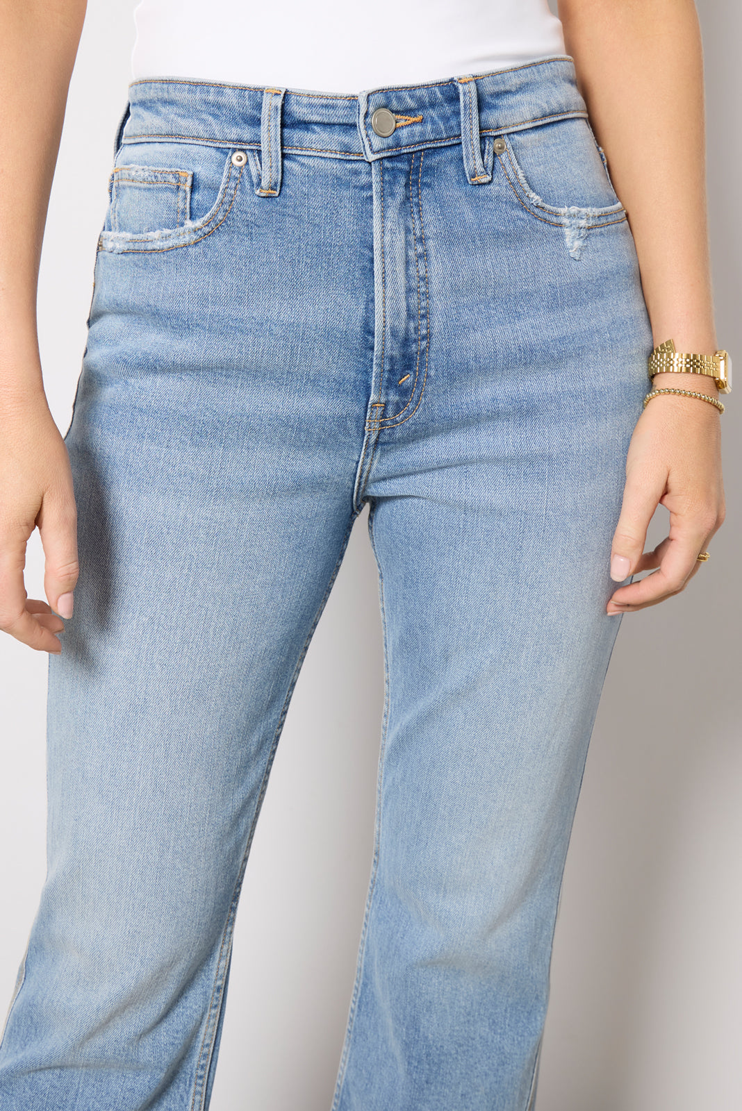 Perfect for everyday wear. these high-rise kick flare jeans by Good American are crafted in soft stretch denim and feature ankle-length raw hems and a versatile blue wash with distressing around the pockets.
