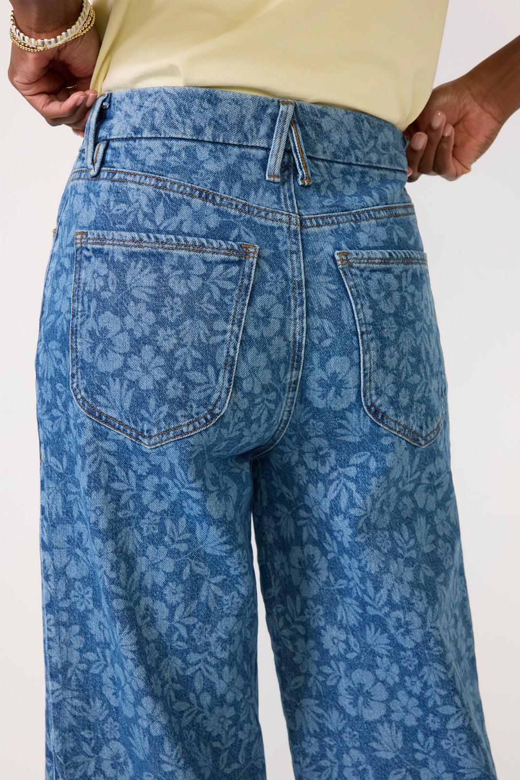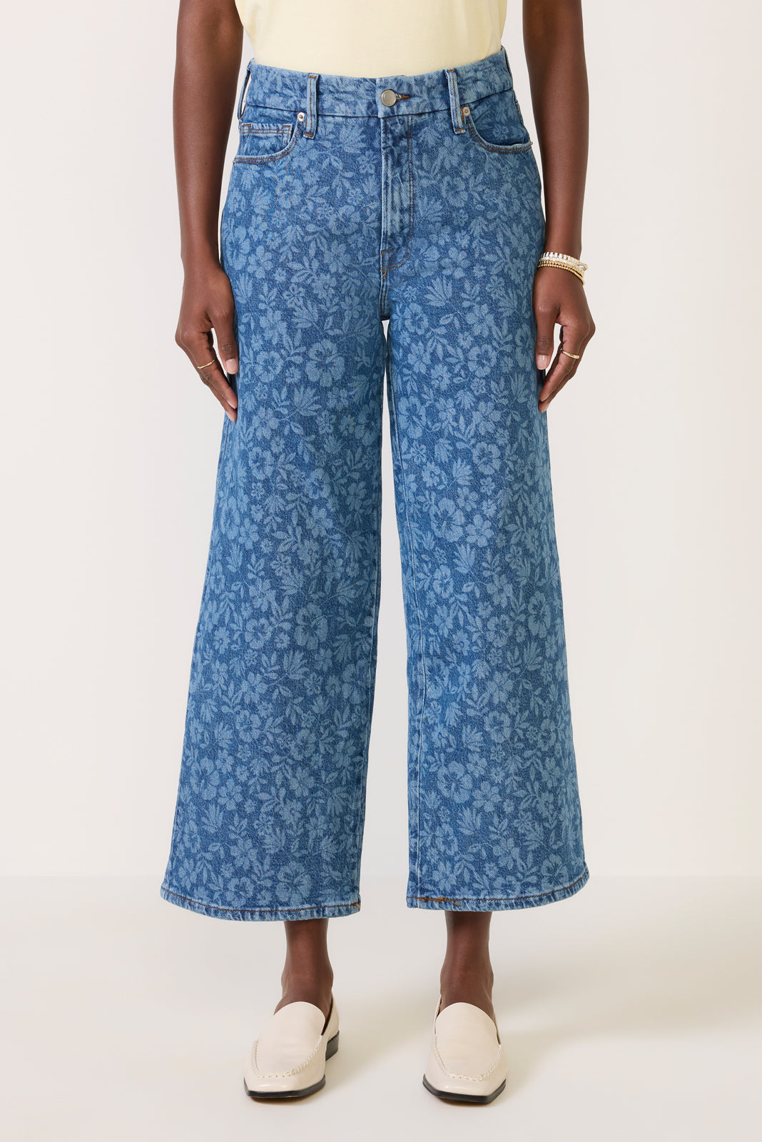 A?tonal floral design updates these fun and flattering wide leg jeans by Good American. Cropped at the ankle. the Good Waist Palazzo jean features a gap-proof waistband. clean hems. and soft stretch denim that moves with you from day to night.