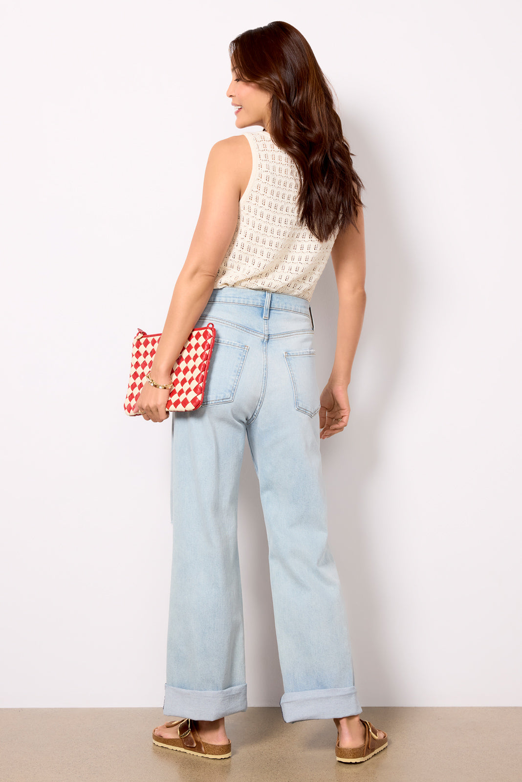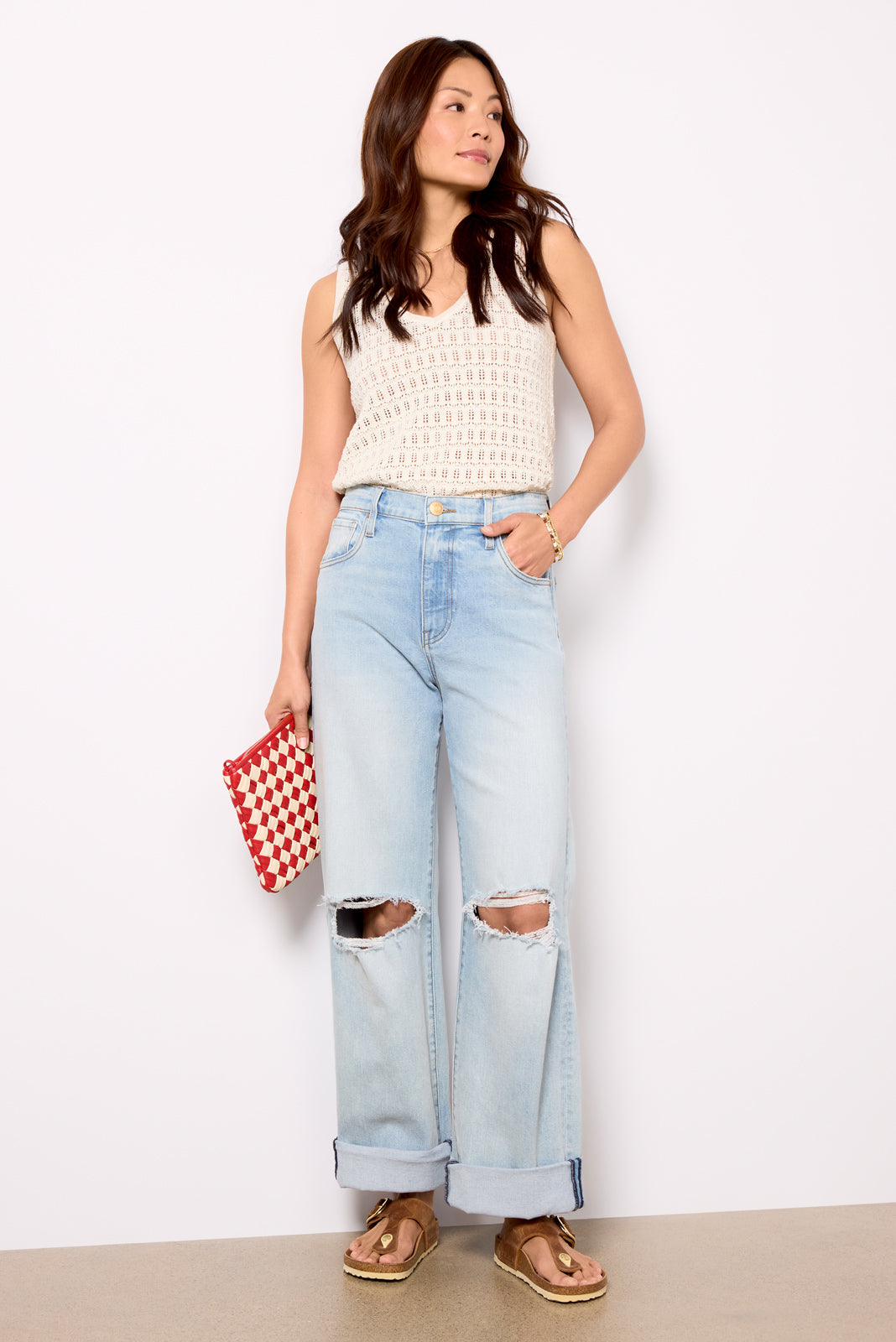 Add to your cuff denim collection with the Gwen Cuff Jean by Kut from the Kloth. featuring a high-rise fit. full-length inseam. and rips on the knees for a lived-in feel.