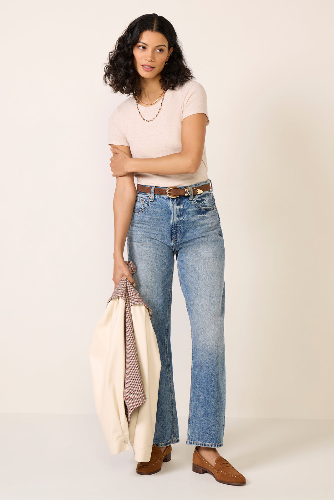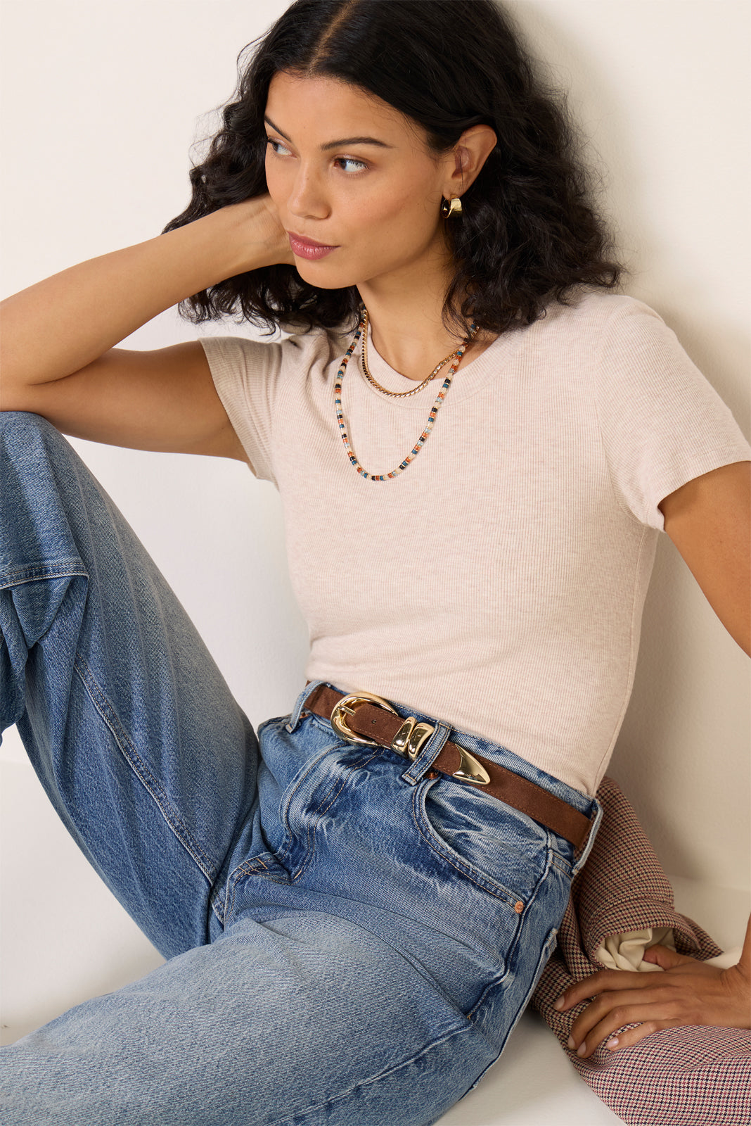 This versatile tee by LNA is the perfect wardrobe essential. crafted in soft rib knit fabric with a crew neckline. slim fit. and short sleeves.?
