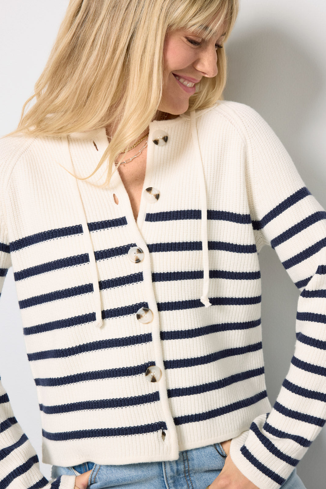 Elevate your sweater collection with the Isabel hoodie by EVEREVE.?Topped with navy stripes. this hooded cardigan features a button-front silhouette. cropped length. and long raglan sleeves.