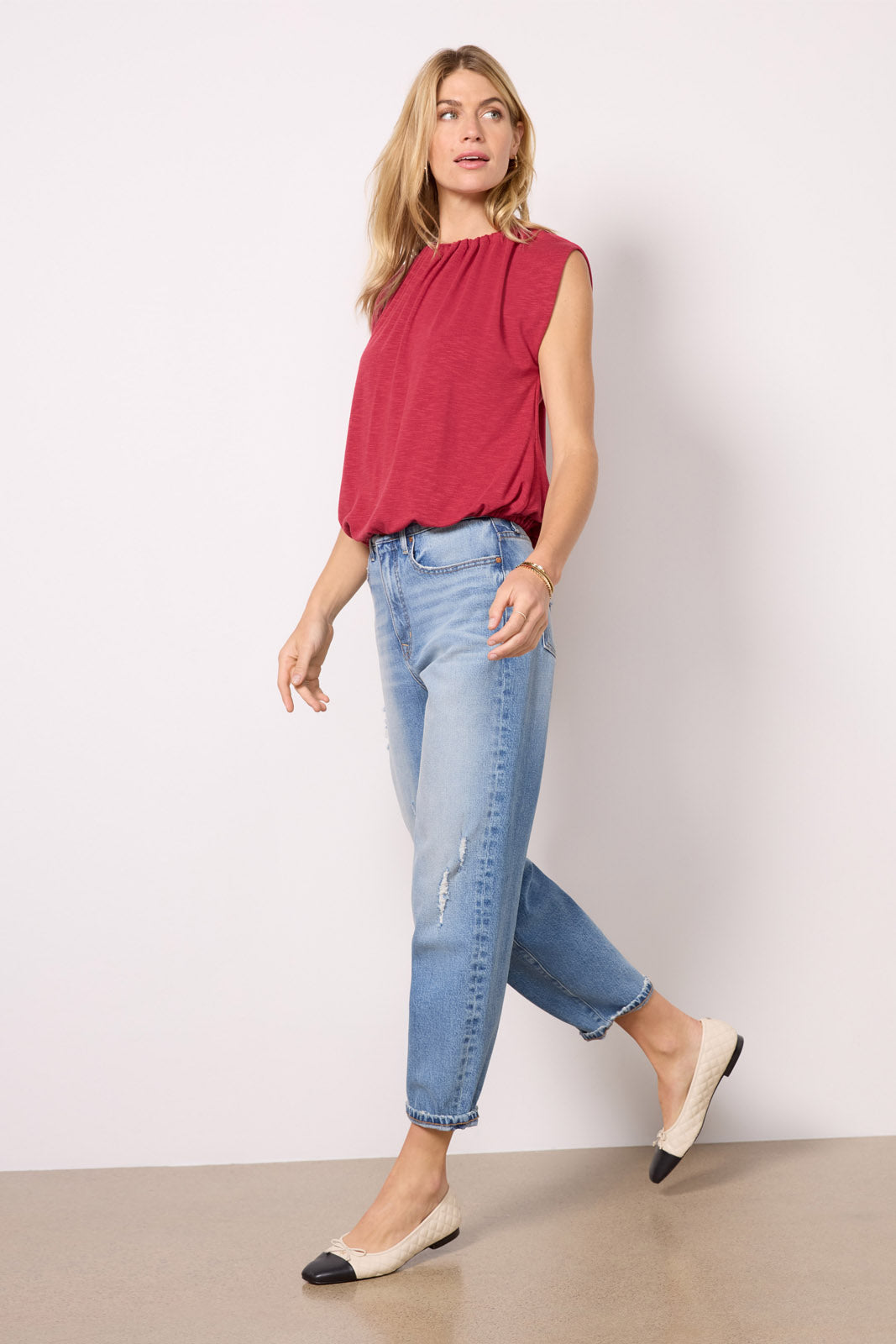 This Michael Stars top is the perfect elevated essential. featuring a sleeveless silhouette with a banded elastic hem. gathered neckline. and soft slub fabric. Wear it day to night with a skirt. jeans. or trousers.