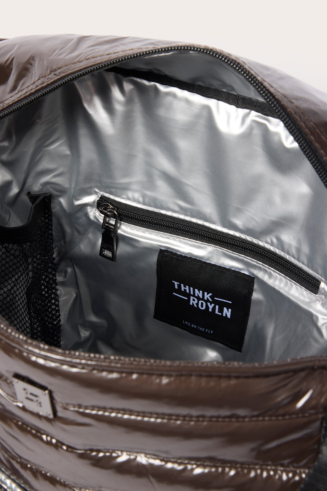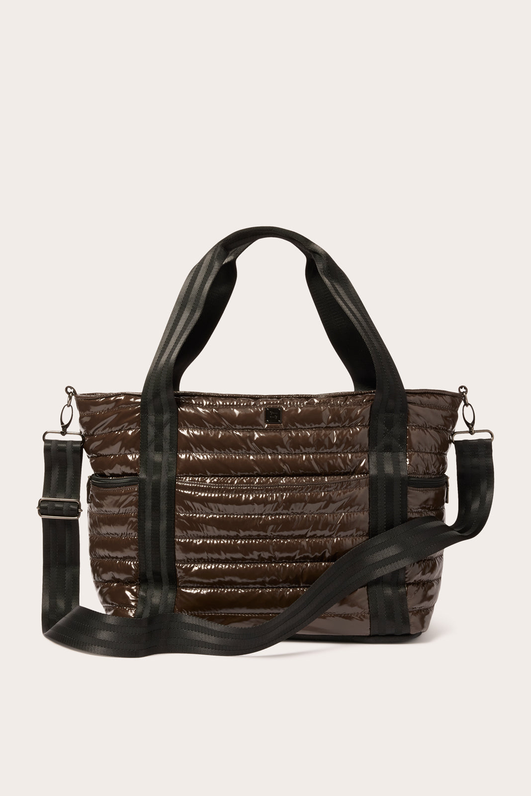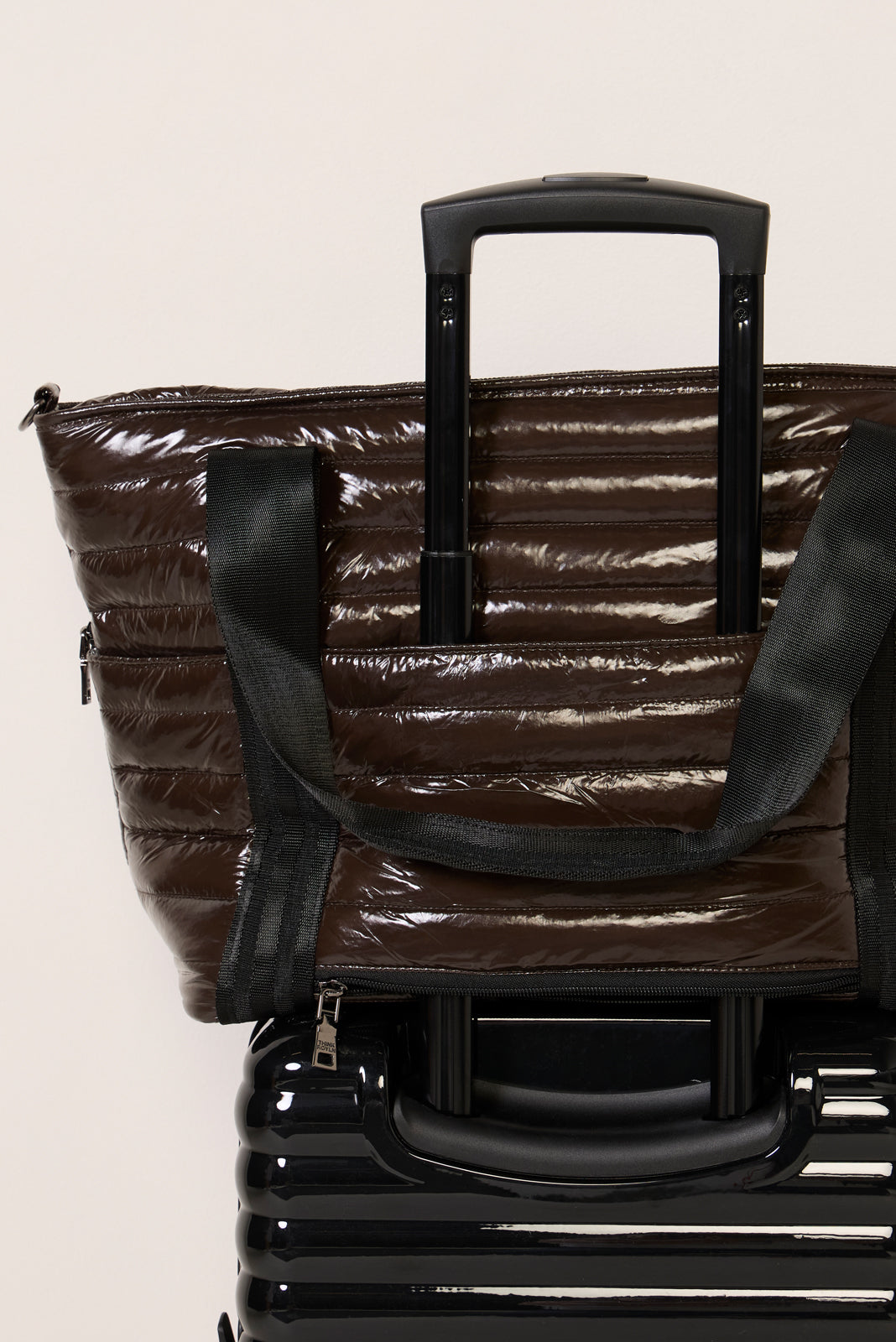 Travel?in style with this go-everywhere tote by Think Royln. Finished in glossy quilting. the Jetset Wingman Tote features a zip-top design with an interior zipper pocket. exterior side zipper pockets. and an exterior trolley slip pocket to attach to your?suitcase handles.?Carry it?on the shoulder. or go hands-free with the detachable. adjustable?crossbody strap.