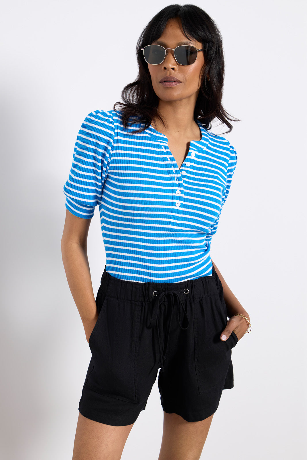 An elevated take on your everyday tee. the Jewel?striped top by Rails is finished in soft?ribbed fabric with a half button placket and?elbow-length puff sleeves.