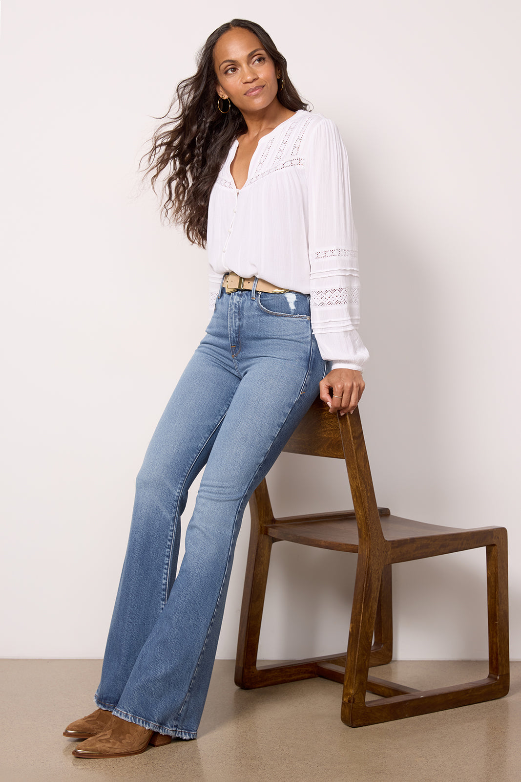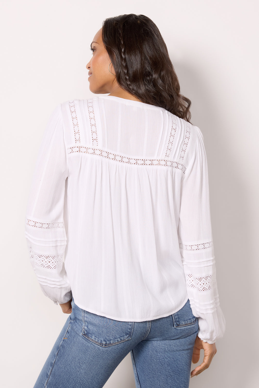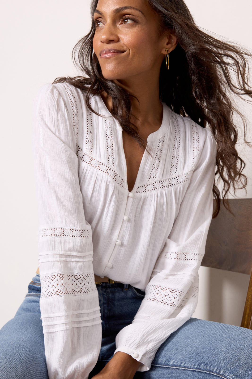 Lace insets detail this gorgeous button-front top by Z Supply. featuring a relaxed. flowy fit. curved hem. and long puff sleeves. Style with booties and your favorite flared jeans.