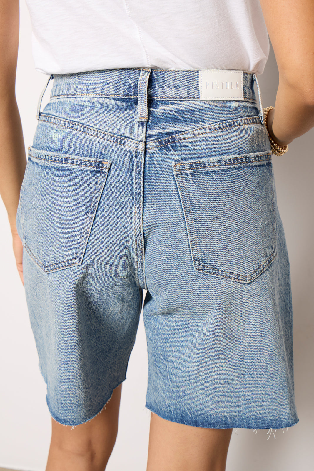 Crafted in a comfort stretch denim. the Kaylee Short by Pistola features a high rise waist. a light blue wash. and a longer inseam with a raw hem.