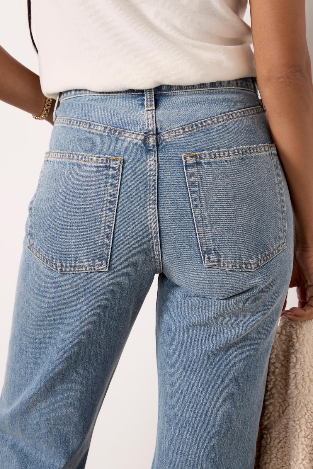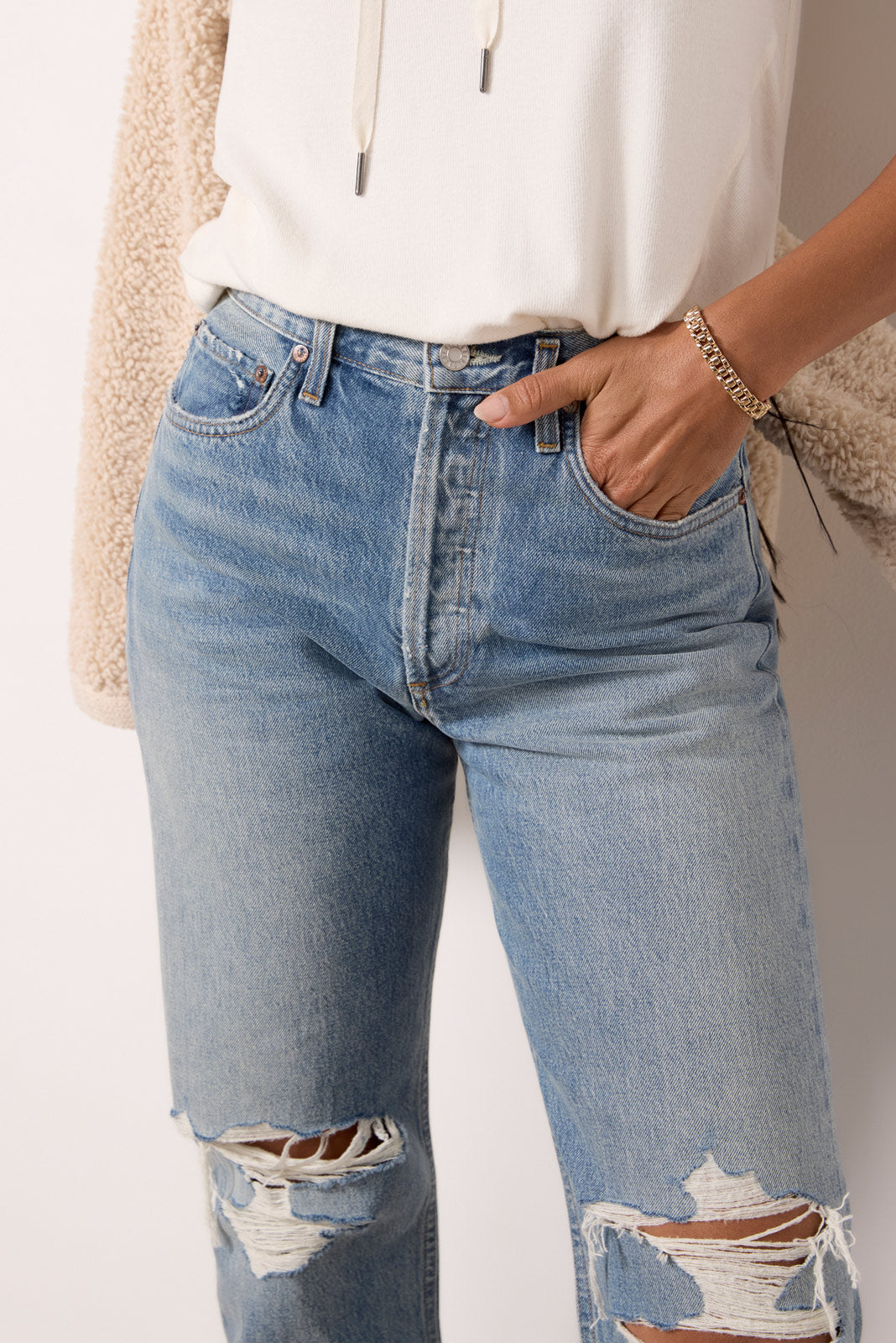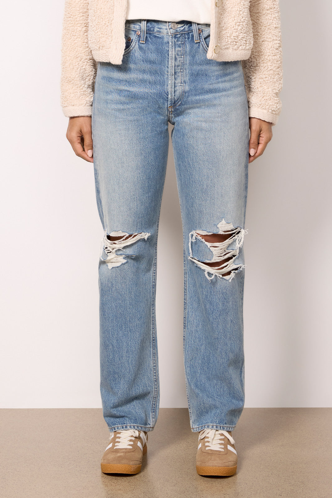 A relaxed?fit and distressed. rigid denim bring vintage appeal to these AGOLDE jeans. featuring a?straight leg. high-rise waist. and clean hems. Style during the day with a pullover and sneakers. then switch to a blouse and booties for a night-out look.