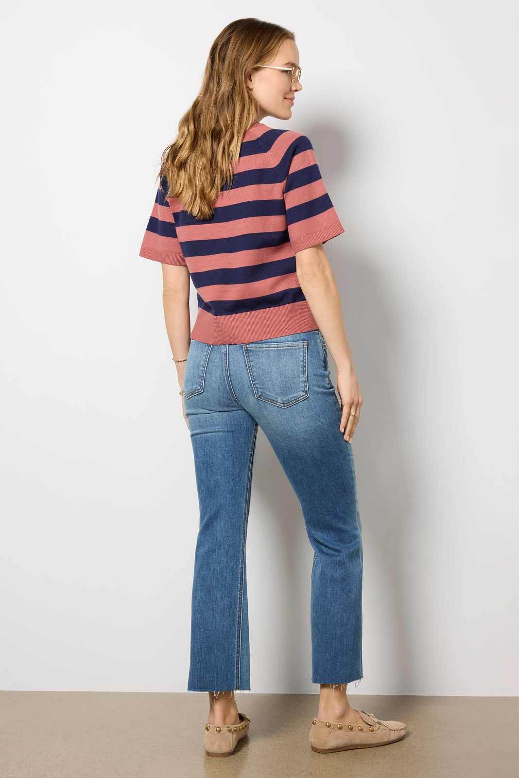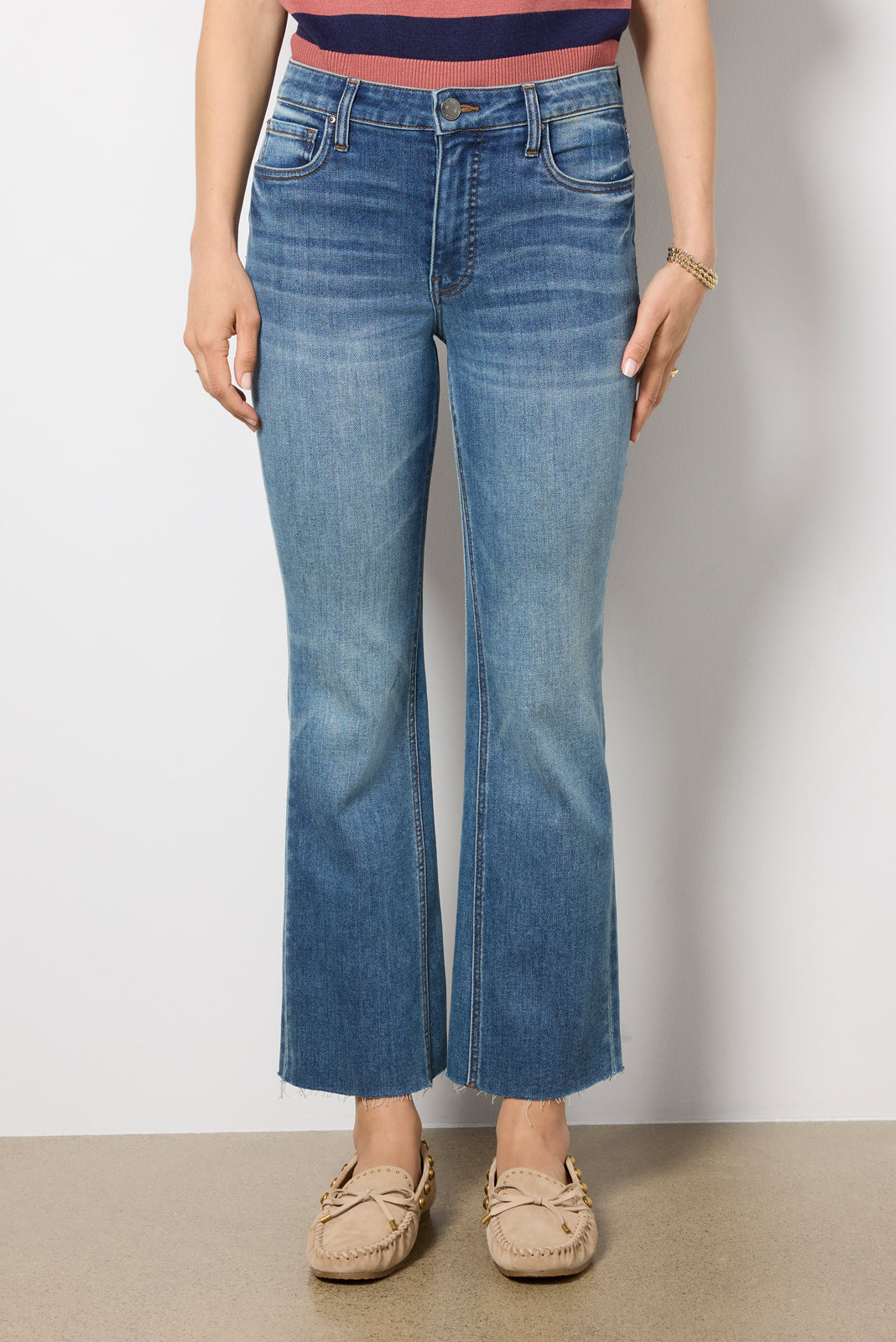 A gently flared leg creates the easy-to-love silhouette of these bootcut jeans by KUT From The Kloth. The Kelsey jean is crafted in soft stretch denim and features a?versatile?blue wash and ankle-length raw hems.