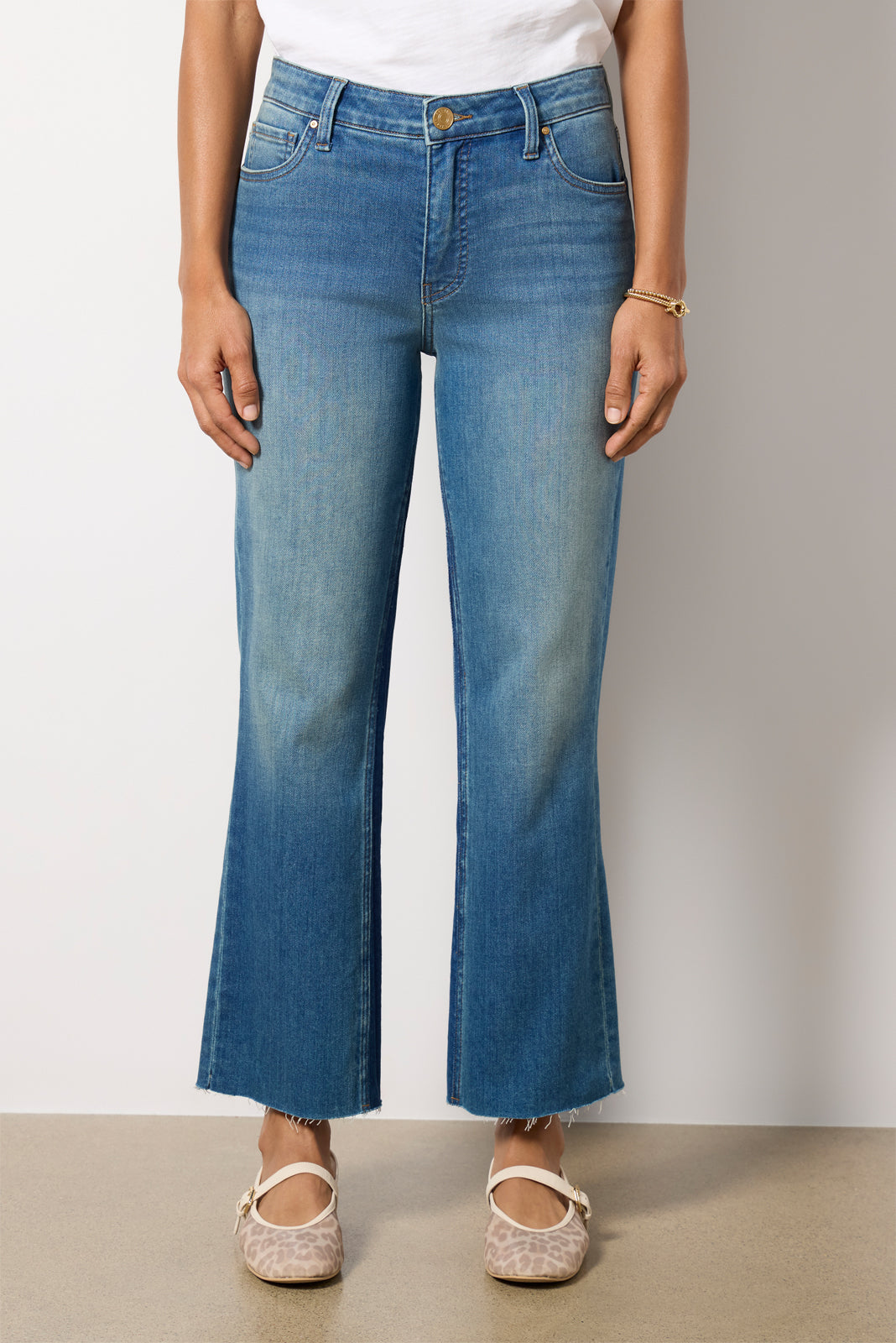 Designed with a contrasting dark wash along the inside seam. the Kelsey flare jean by KUT From The Kloth is perfect for day-to-night wear. crafted in comfortable stretch denim with ankle-length raw hems.