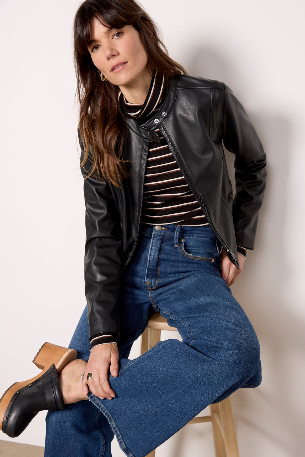 Add a little edge to your look with the Lennox Racer Moto. Crafted in vegan leather. this versatile jacket features a snap tab collar. flattering directional seaming. a vertical zipper chest pocket. and two front zipper side pockets.?