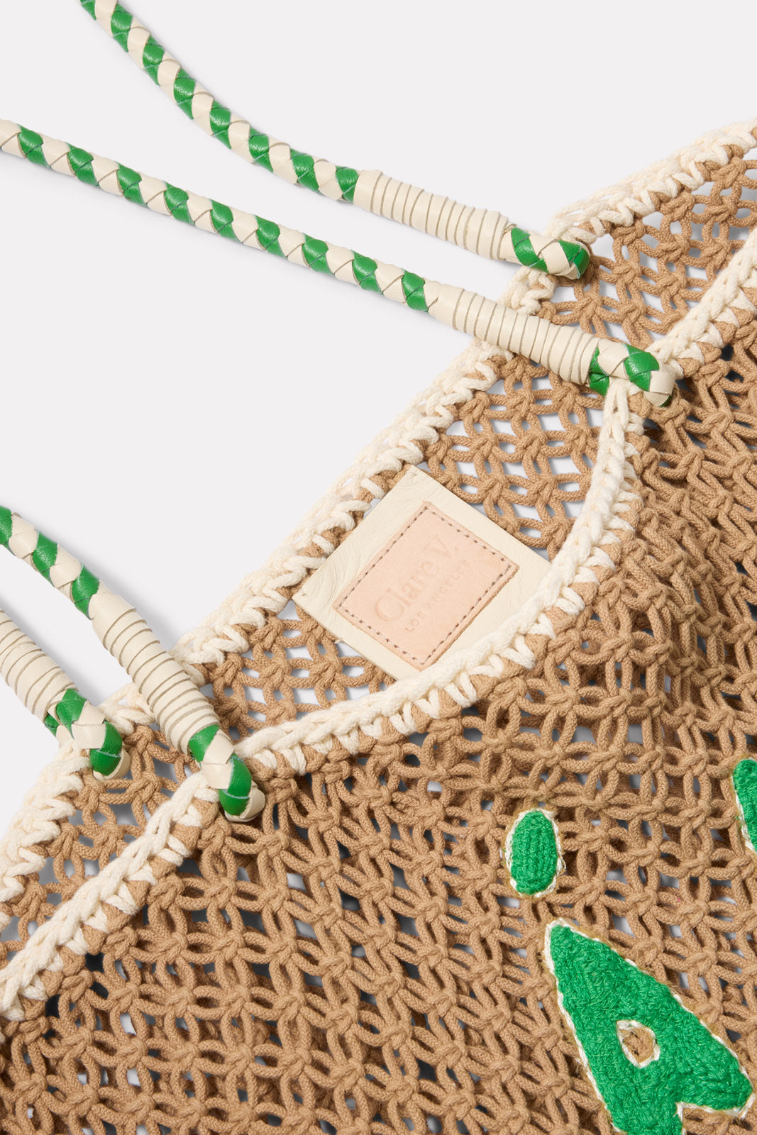 Carry all your beach day necessities with this crochet tote by Clare V. Crafted in woven cotton with leather-wrapped straps. this fun and functional bag features an open-top design with an unlined interior.