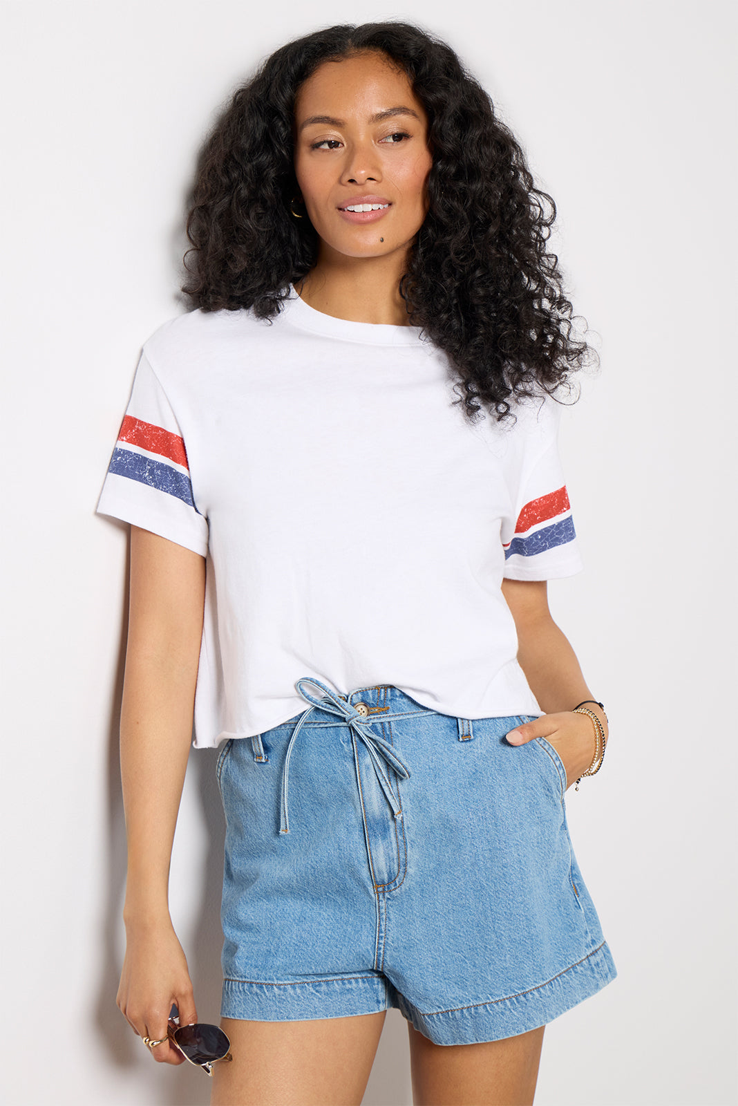 Add a sporty flair to your summer wardrobe with this varsity t-shirt by perfectwhitetee. finished in comfy cotton fabric with a cropped fit. raw edge hem. and striped short sleeves.