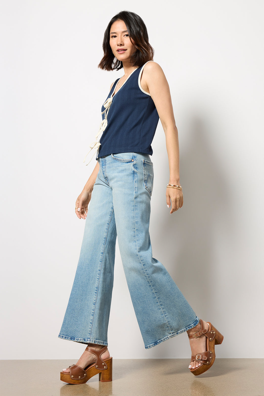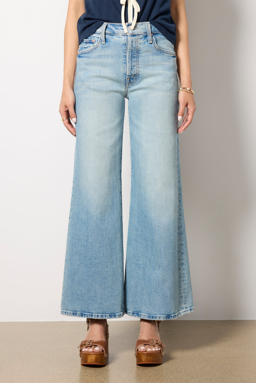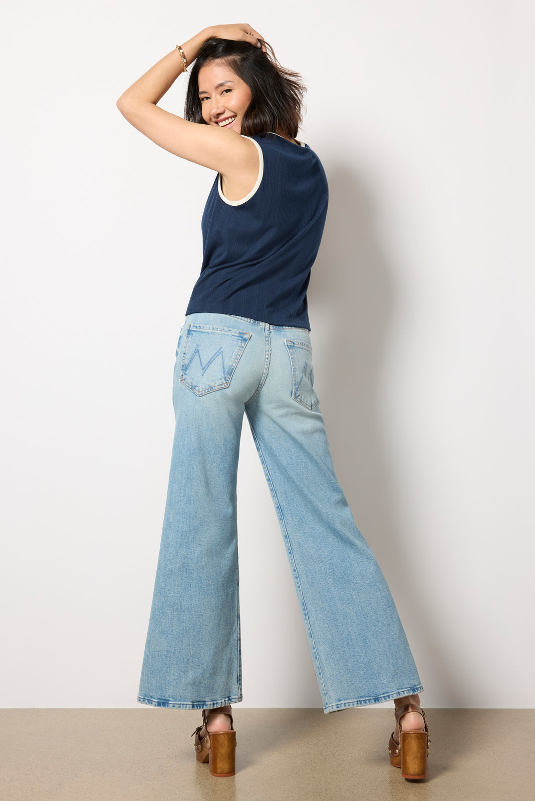 The Lil?Tomcat Roller jean by MOTHER is a petite?wide leg silhouette. crafted in soft. semi-rigid denim with a?full-length 29 inseam. clean hems. and?light blue wash. Designed to complement petite body types. these jeans feature a higher knee placement. shorter inseam. and shorter rise for a perfect. always-flattering fit.