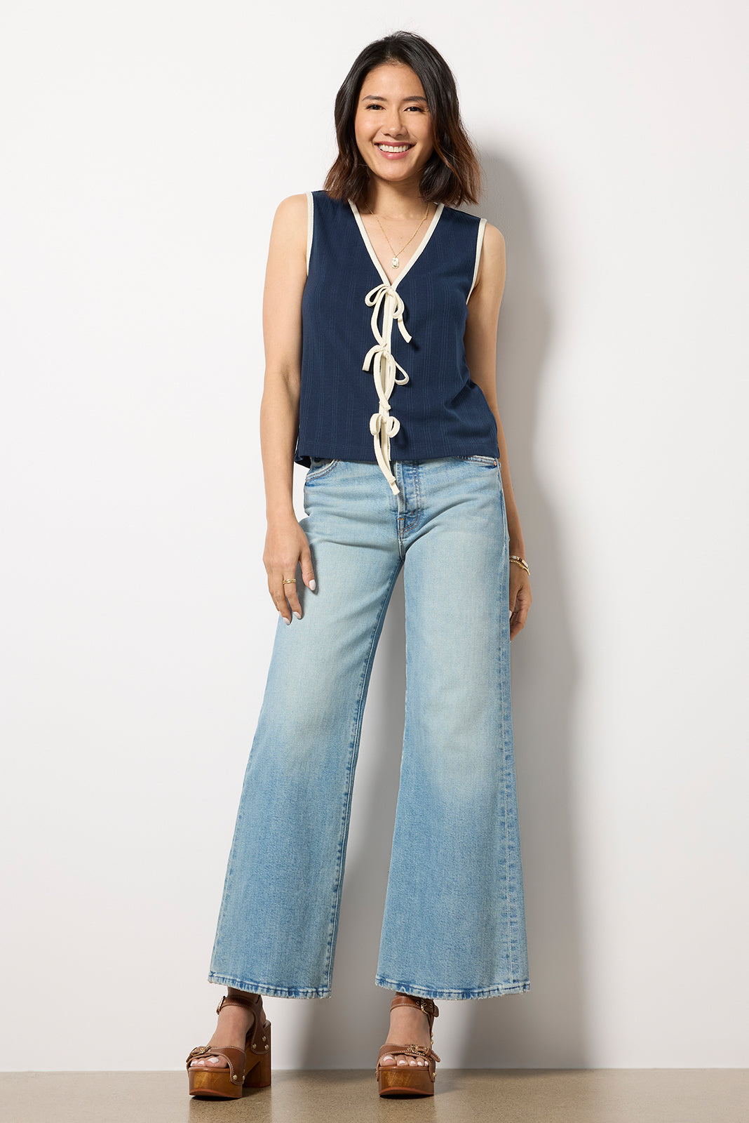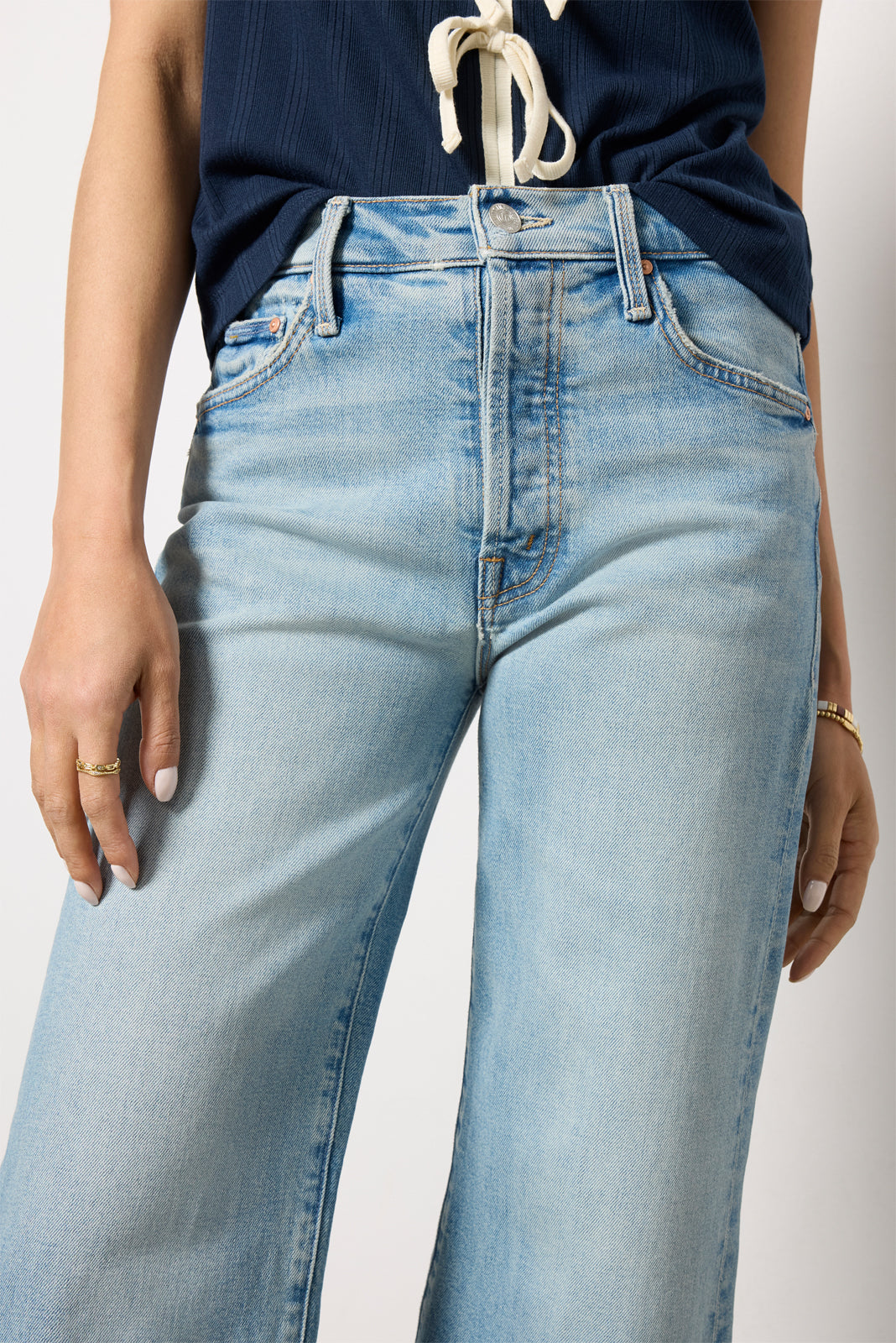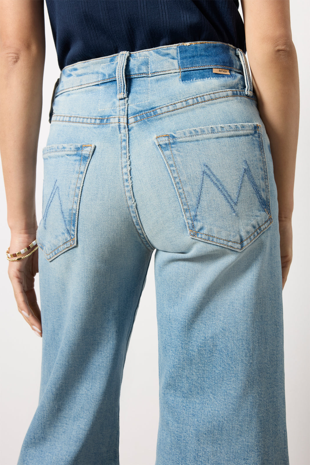 The Lil?Tomcat Roller jean by MOTHER is a petite?wide leg silhouette. crafted in soft. semi-rigid denim with a?full-length 29 inseam. clean hems. and?light blue wash. Designed to complement petite body types. these jeans feature a higher knee placement. shorter inseam. and shorter rise for a perfect. always-flattering fit.