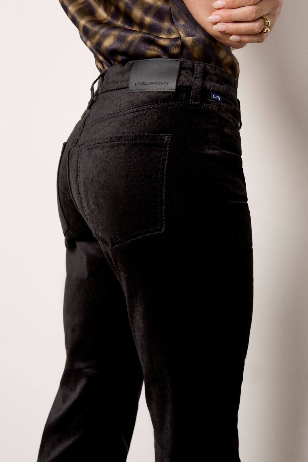 Finished in soft stretch velvet. these flattering flared pants by Citizens of Humanity feature a high-rise fit. full-length hems. and front welt pockets for a polished feel. Pair with a blouse or sweater for a chic seasonal look.