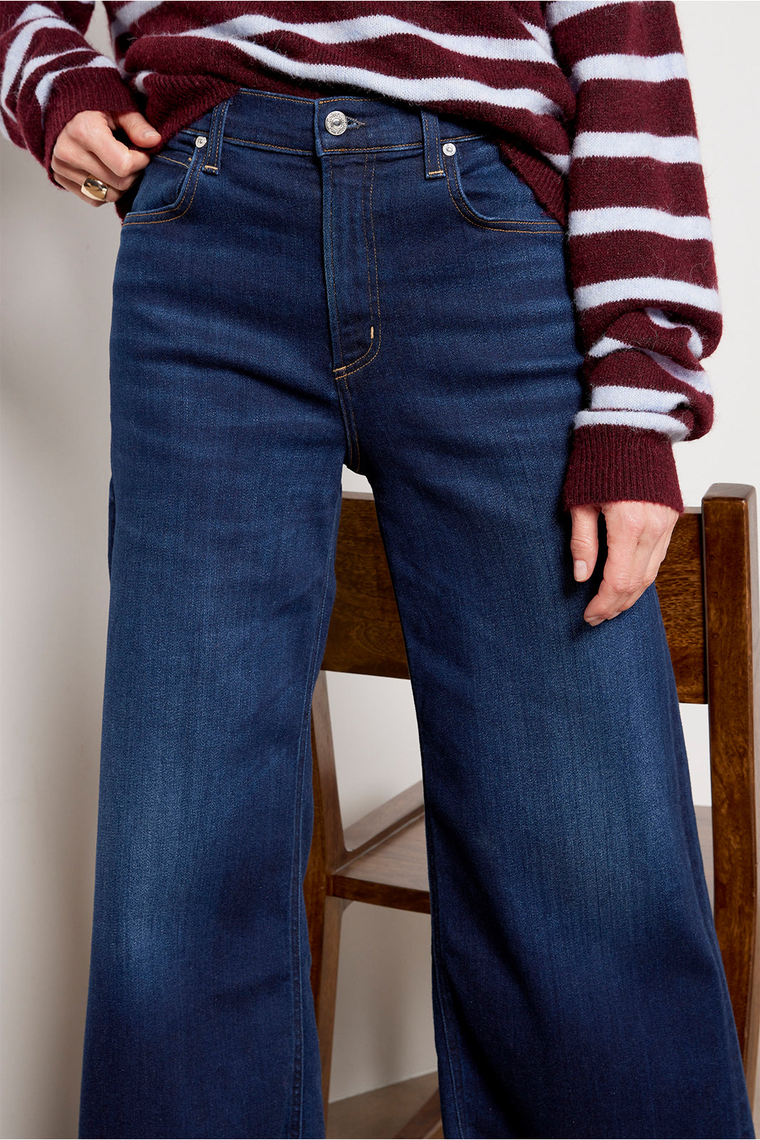 A relaxed fit defines?the stylish Lyra wide leg jean by Citizens of Humanity. Crafted in soft cotton-blend denim. these dark-wash jeans feature a high-rise fit. zipper fly closure. and raw hems cropped?at?the ankle.