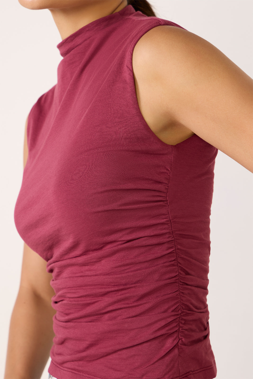 Crafted in a soft and stretchy cotton fabric. the Madeline Top by Velvet was designed to flatter. This tank features a mock neckline. flattering ruching on the sides. and a fitted silhouette.?