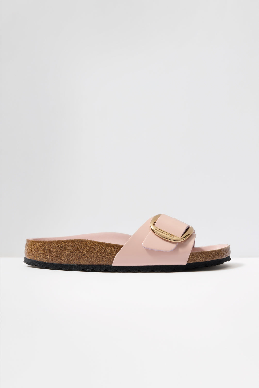 A high-shine finish elevates these versatile Birkenstock sandals. featuring a single strap design with a buckle accent.