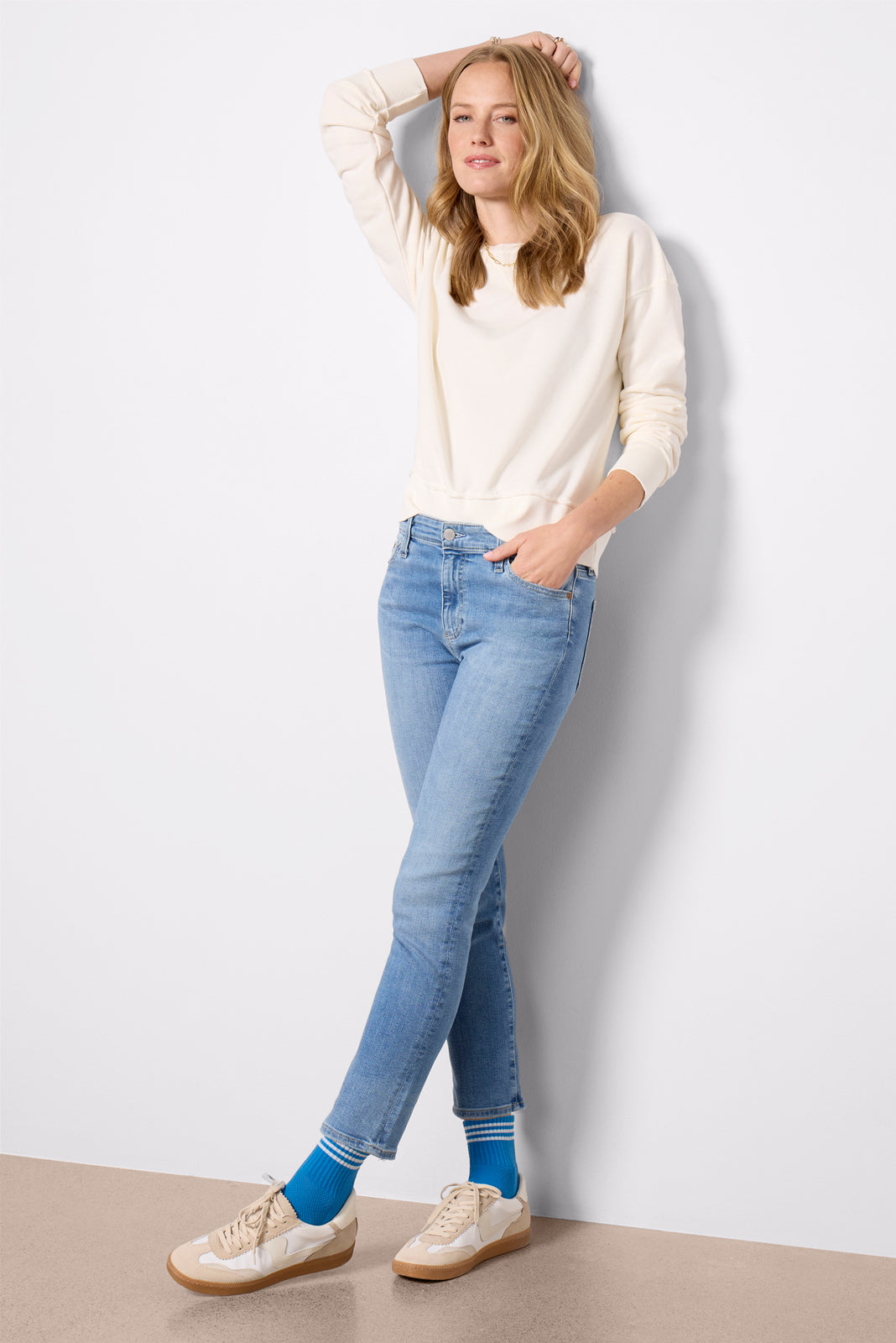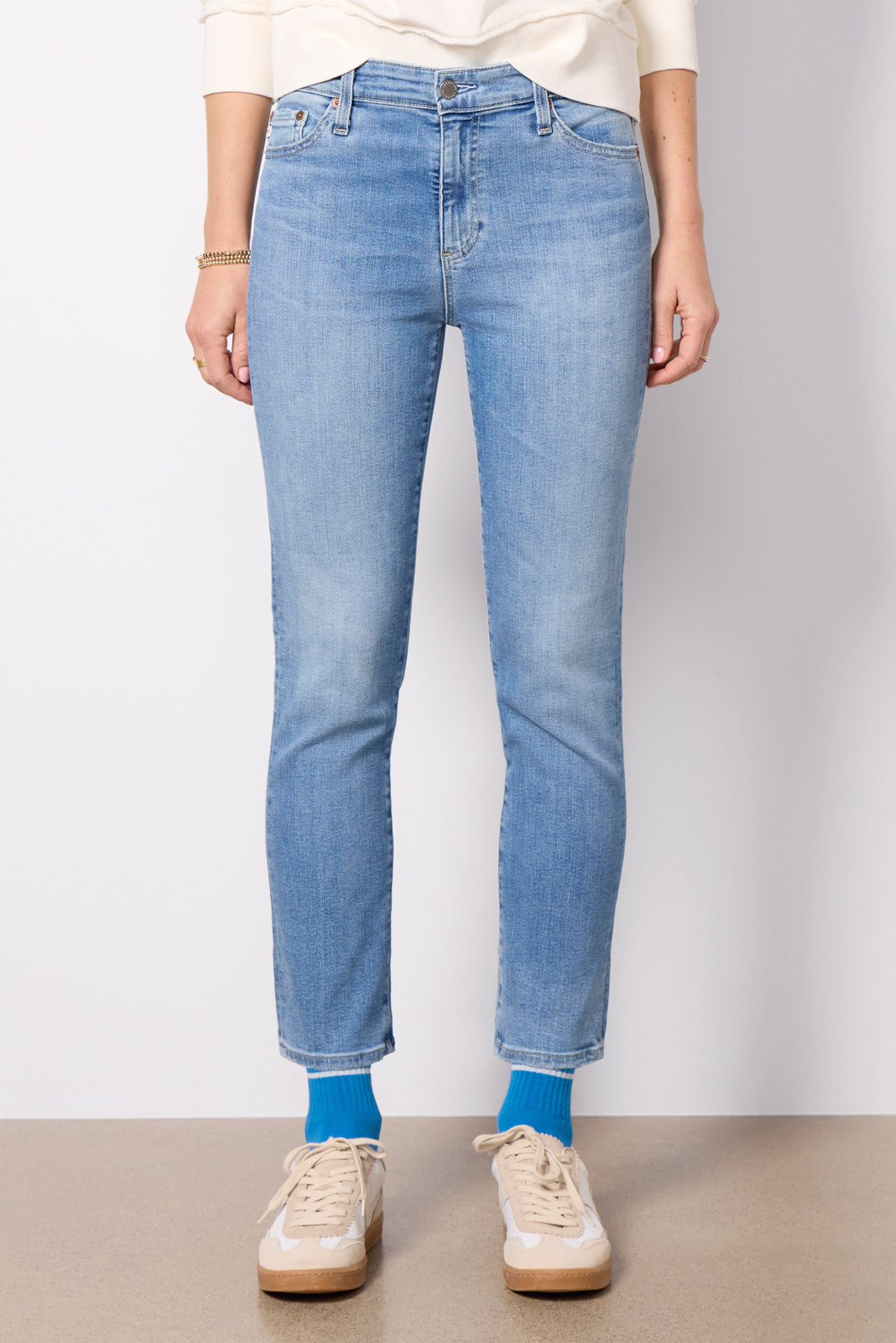 A slim straight leg creates the sleek silhouette of these AG jeans. crafted in soft cotton-blend denim with a mid-rise waist. ankle-length hems. and a versatile light blue wash.