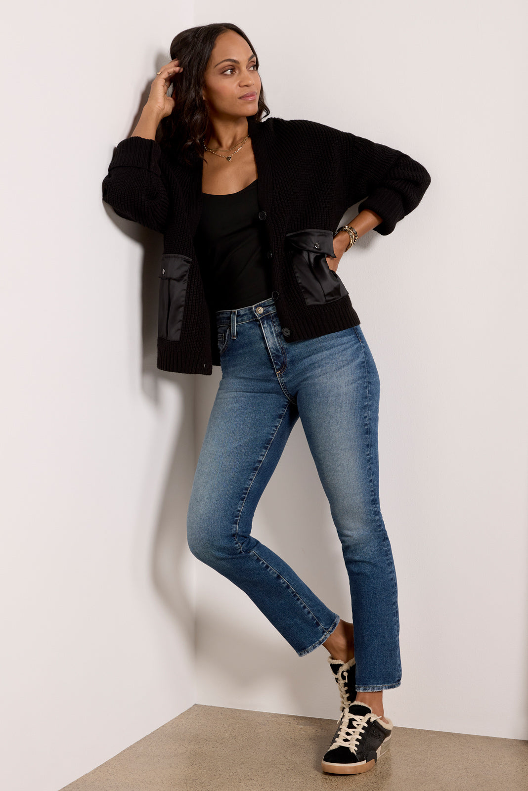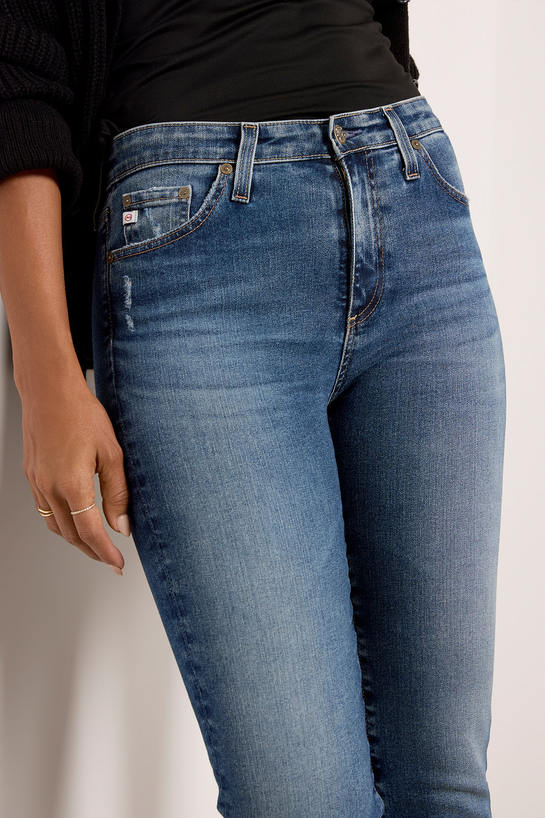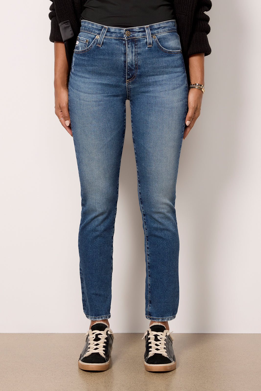 A slim straight leg creates the sleek silhouette of these AG jeans. featuring a mid-rise waist. full-length inseam. and a hint of distressing at the pocket and hems. The faded blue wash makes them perfect for day-to-night wear.